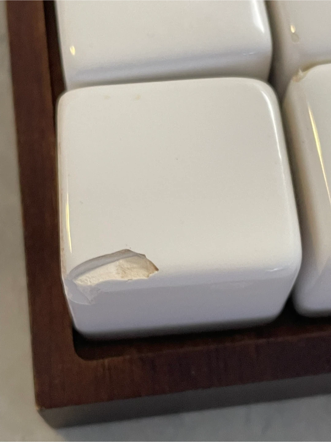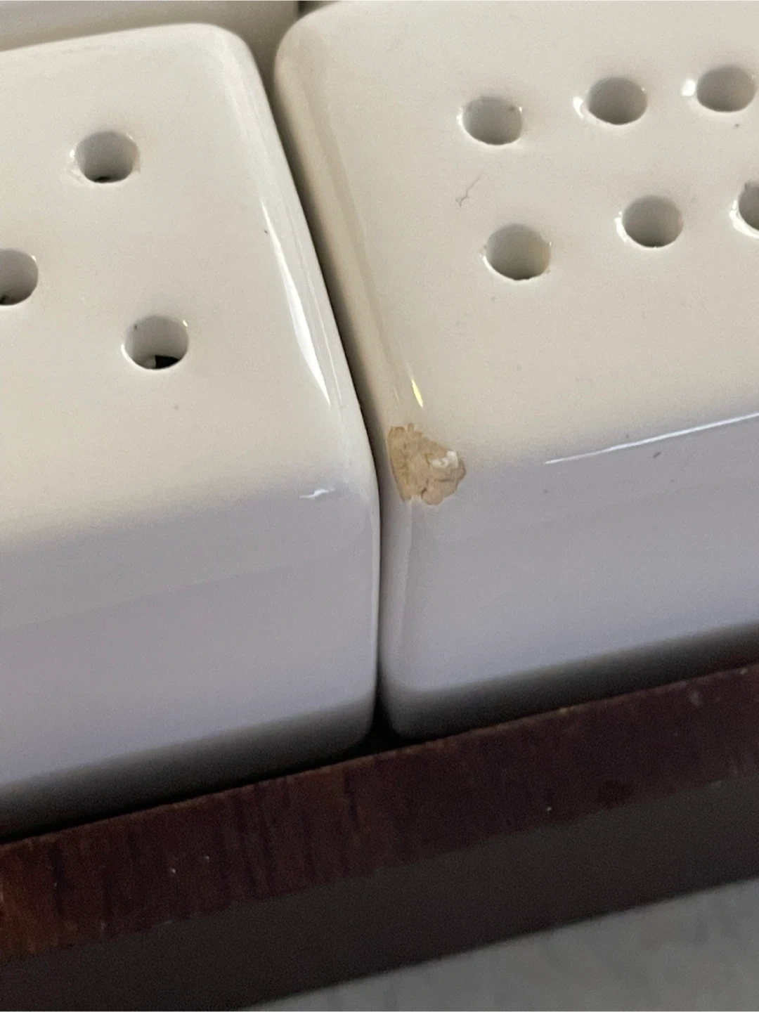 26Selling a set of dice-shaped salt and pepper shakers with a wooden tray. They're a cute addition to any kitchen or dining table. Please note there are some small chips on a couple of the shakers, as shown in the photos