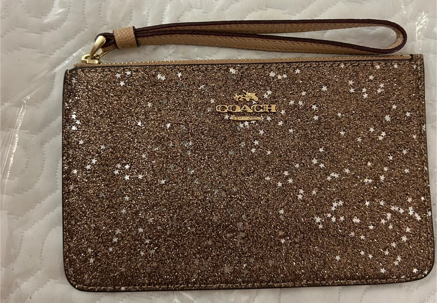 Selling a Coach wristlet. It's in new unused condition and perfect for carrying your essentials. The wristlet features a zipper closure and a convenient wrist strap. It has a stylish design with the Coach logo.