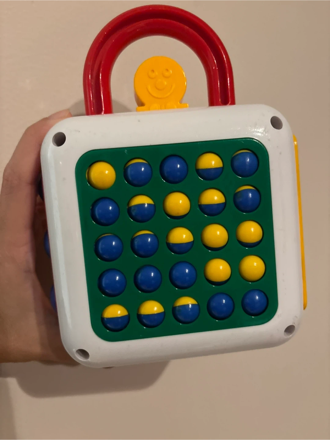 Selling a Tomy Busy Box! It's a cube-shaped toy with different activities on each side. One side has a rotating bunny puzzle, another has numbered buttons, and another has a connect-four style game with yellow and blue balls. It's a great toy for keeping little ones entertained
