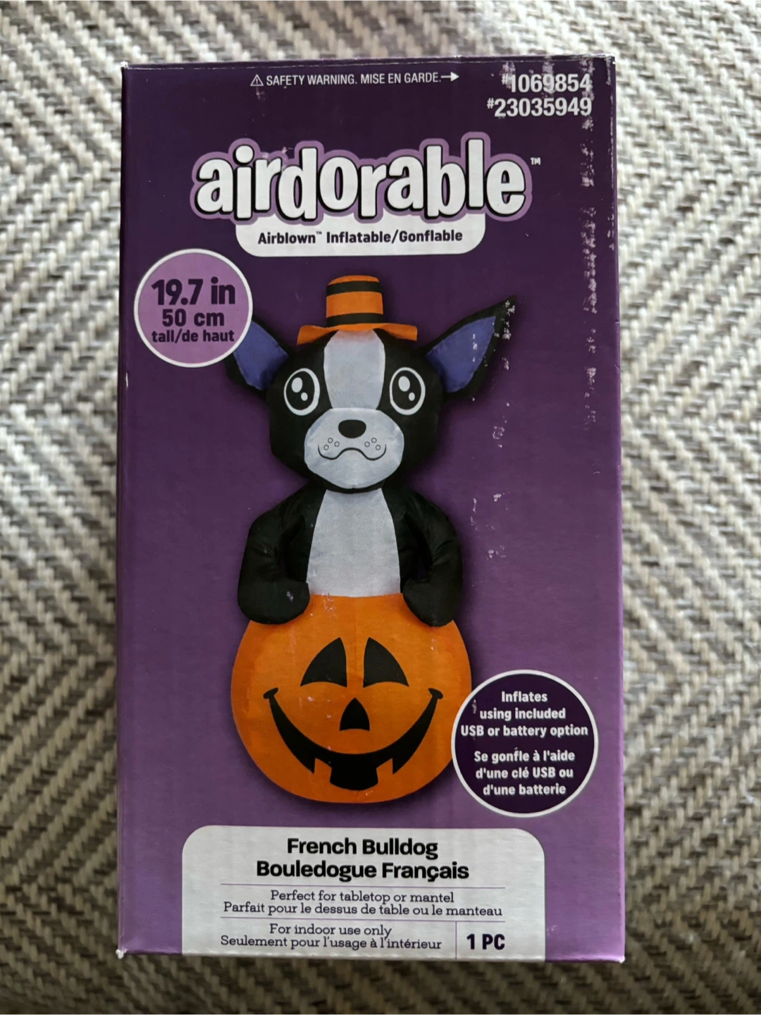 Get ready for Halloween with this adorable Airdorable French Bulldog inflatable! It's brand new in the box and ready to bring some spooky fun to your tabletop or mantel. It inflates using either a USB cable or a battery pack, both of which are included. It measures 19.7 inches (50 cm) tall, making it the perfect size for indoor use