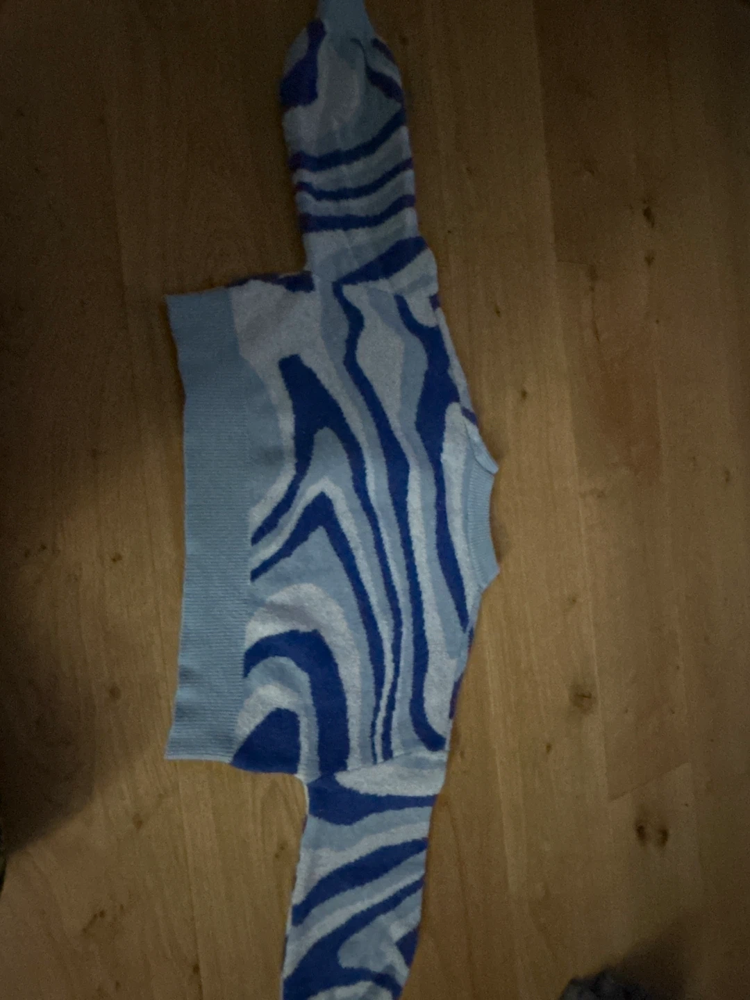 Selling a Dreamers by Tobi sweater in size XS. It features a unique blue and white wavy pattern. It's in great condition and ready for a new home!
