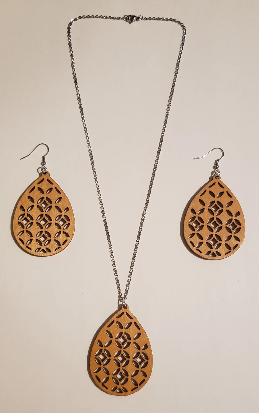 Here's a cute matching necklace and earrings set! The pieces are made of wood and have a teardrop shape with a geometric cutout design. The necklace has a stainless steel chain, and the earrings have hook closures. Free pickup in Queens NY