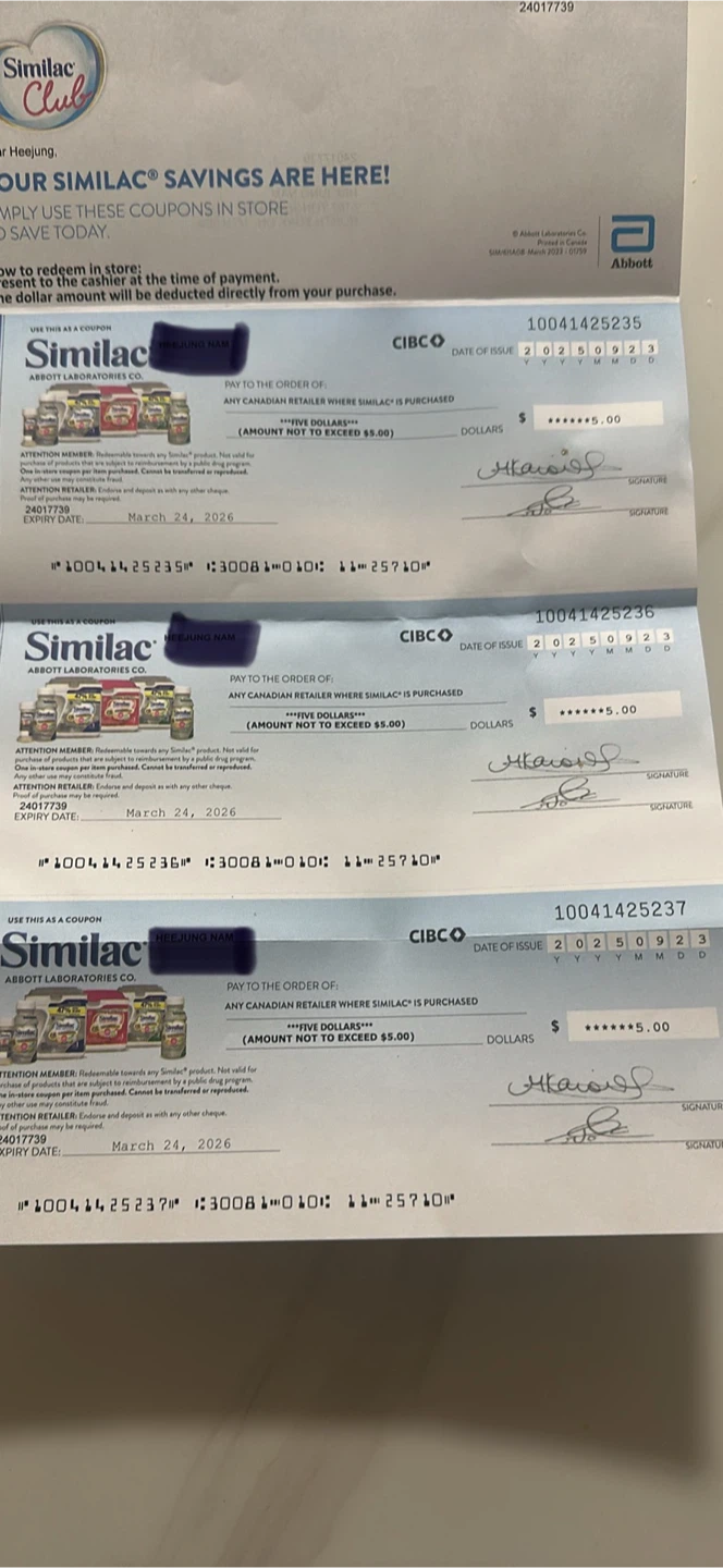 I have three Similac coupons, each worth $5. They can be used at any Canadian retailer where Similac products are sold. Each coupon expires on March 24, 2026