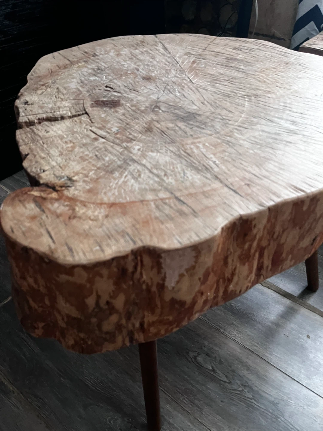 792Price is firm. Heavy Selling a unique wooden tree stump coffee table! It's a real statement piece, made from a solid wood slice with distinct natural markings and a rustic feel. The table has three sturdy legs, making it a charming addition to any living space Measures 21”H x 26”D x 6” thick . Pick up only. Closest intersection is Jane St and Eglinton Ave.