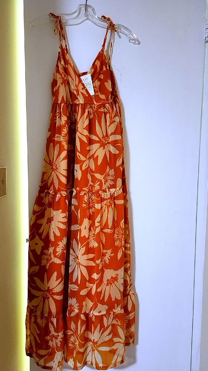 346A beautiful, brand new floral maxi dress! It's a size small and features a lovely floral pattern on an goldish organge background. Perfect for pairing with boots and leather or denim jacket.The dress has not been worn and has tags.