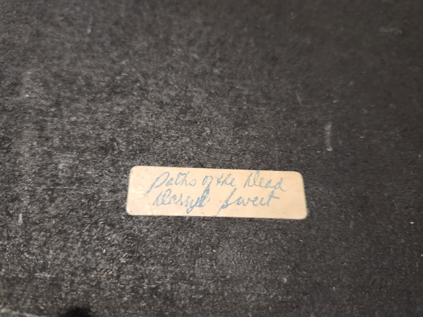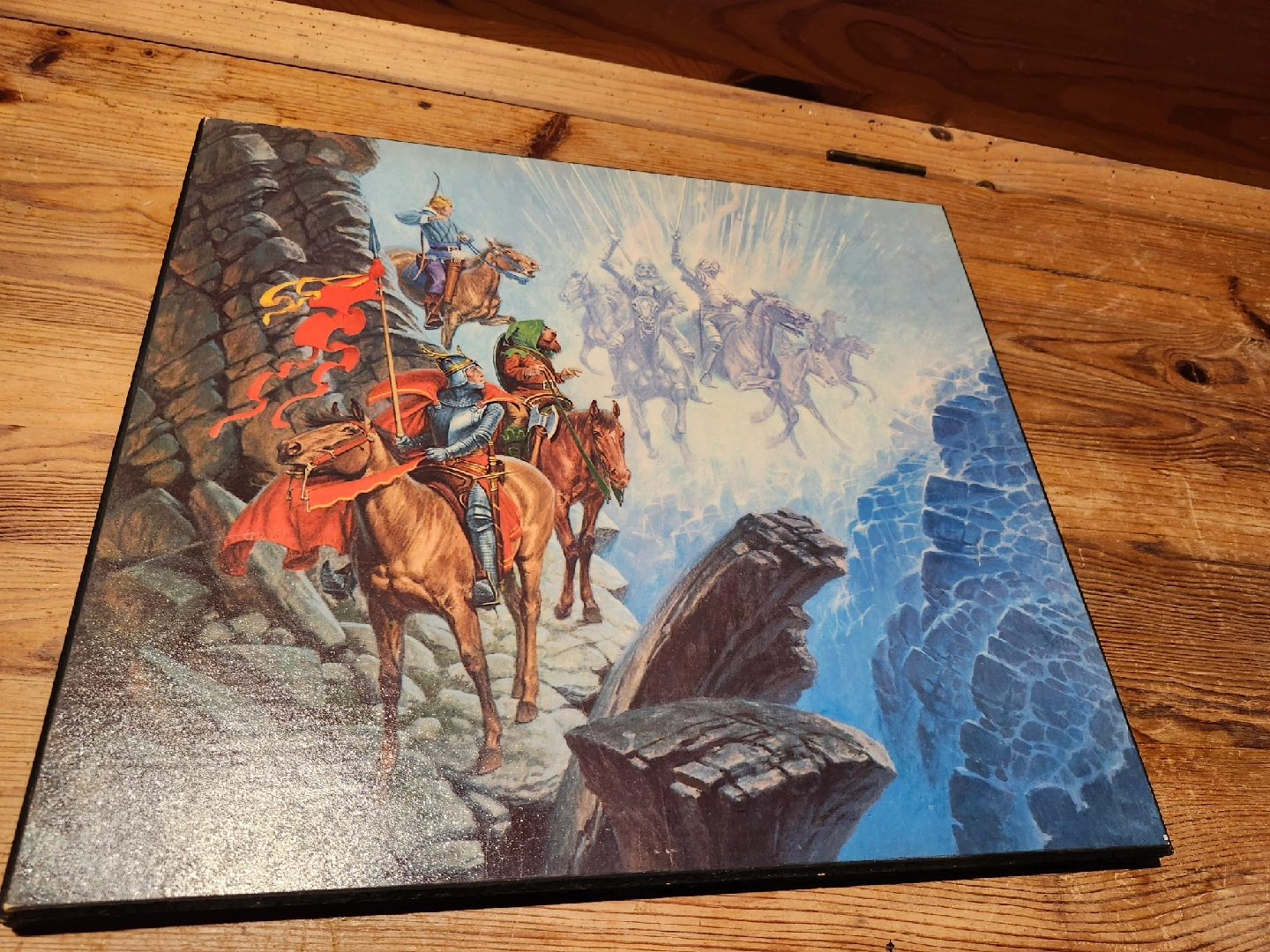 1000+This is an art print titled 'Paths of the Dead' by Darryl Sweet. It depicts a scene with knights and riders in a fantasy setting. It's a unique piece for any art lover! This is a painting titled "The Paths of the Dead" by artist Darrell K. Sweet, created in 1980. The painting depicts a scene from J.R.R. Tolkien's The Lord of the Rings, specifically the journey through the Paths of the Dead. The three figures on horseback are Aragorn, Legolas, and Gimli. The ghostly figures in the background represent the Dead Men of Dunharrow, also known as the Army of the Dead, who were cursed for breaking an oath to Isildur. Aragorn, as the heir of Isildur, is able to command the Dead Men to fulfill their oath and fight against the forces of Sauron. approx 13 x 15 in