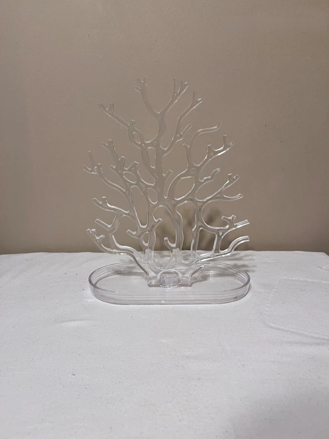 Selling a clear plastic jewelry tree stand. It's perfect for organizing and displaying your necklaces, bracelets, and earrings. It's in great condition and ready to find a new home !