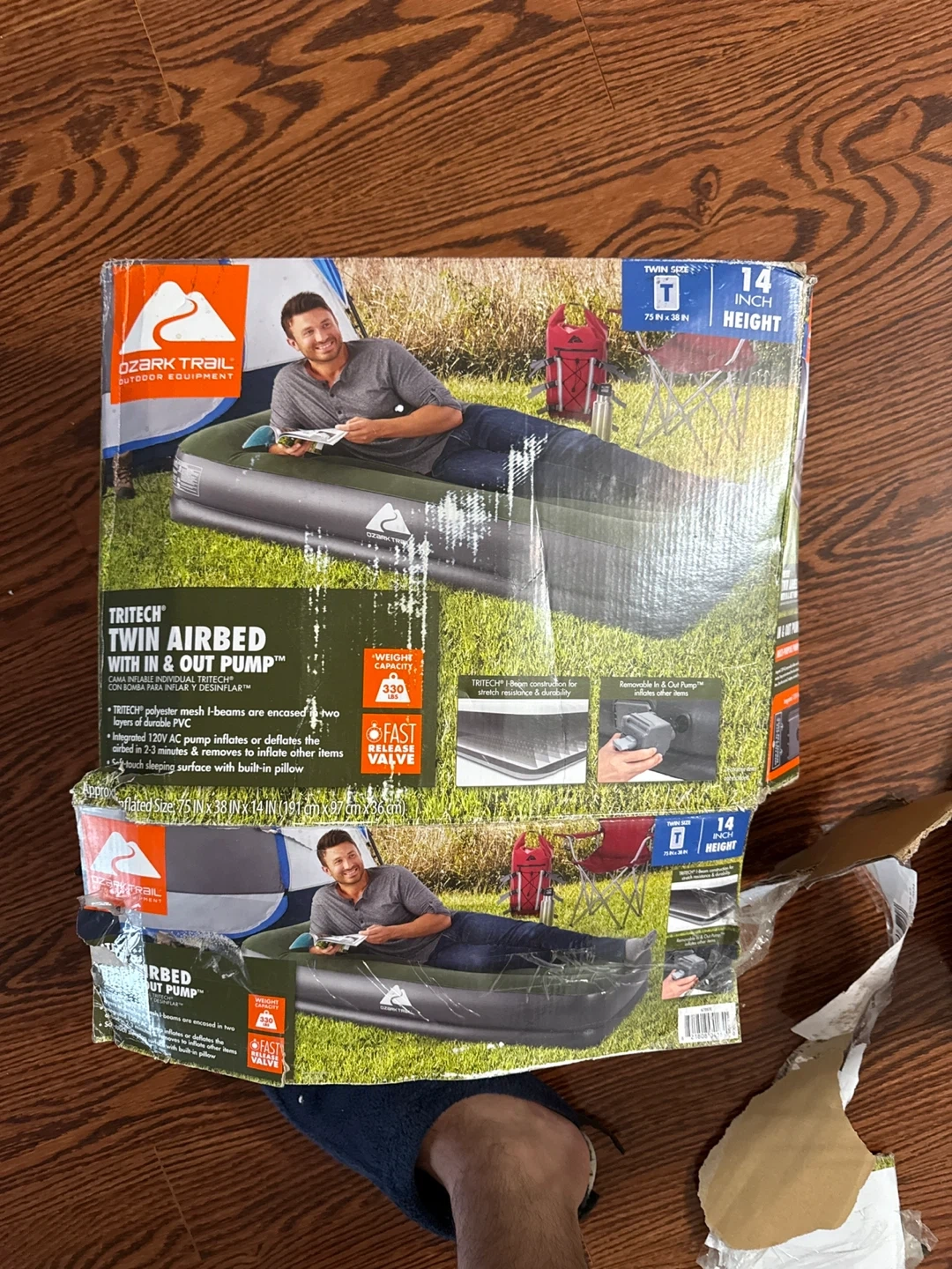 Selling an Ozark Trail Twin Air Bed with a built-in pump! It's in great shape and ready for a new home. It comes with a fast valve system that inflates or deflates other items. The airbed has a flocked sleeping surface with a built-in pillow for extra comfort.