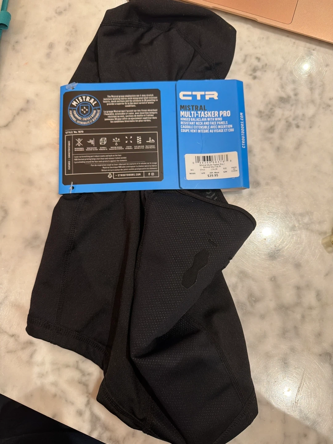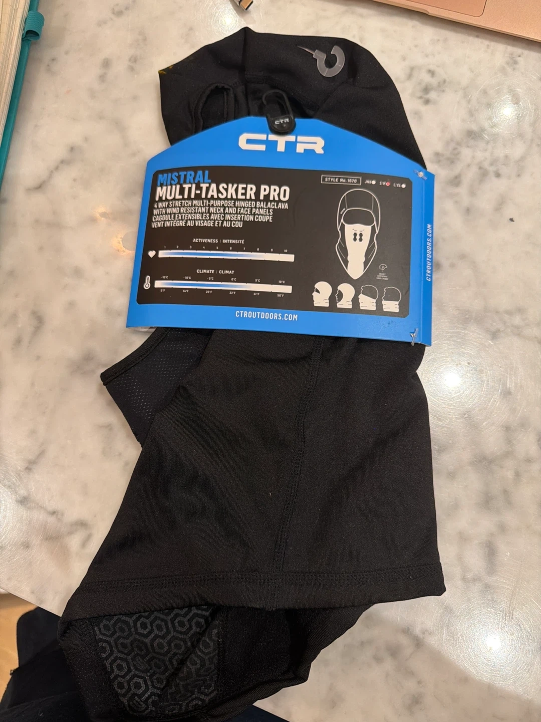 Selling a brand new CTR Mistral Multi-Tasker Pro balaclava! It's a 4-way stretch multi-purpose hinged balaclava with wind resistant neck and face panels. Perfect for keeping warm during outdoor activities. Style No. 1670. Size S/M to L/XL.