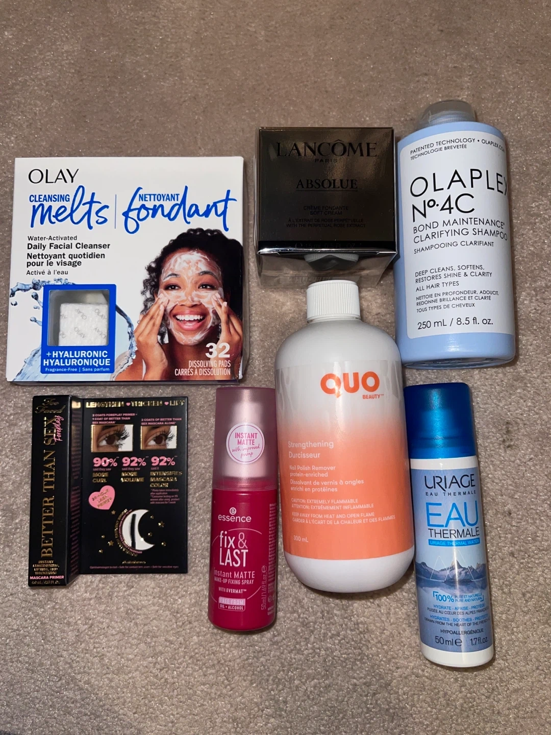 110Selling a bundle of skincare and makeup products! Includes: - Olay Cleansing Melts Fondant Daily Facial Cleanser (32 dissolving pads) - Lancome Absolue Crème Fondante Soft Cream - Olaplex No. 4C Bond Maintenance Clarifying Shampoo (250 ml) - Too Faced Better Than Sex Mascara Primer - Essence Fix & Last Instant Matte Make-Up Fixing Spray (50 ml) - Quo Beauty Strengthening Nail Polish Remover (300 ml) - Uriage Eau Thermale Water (50 ml)