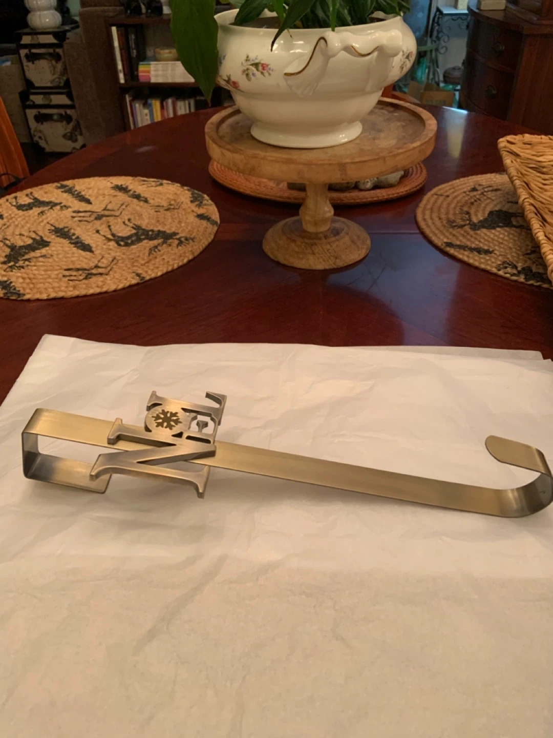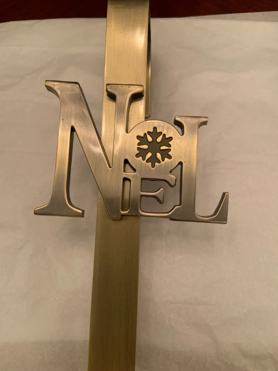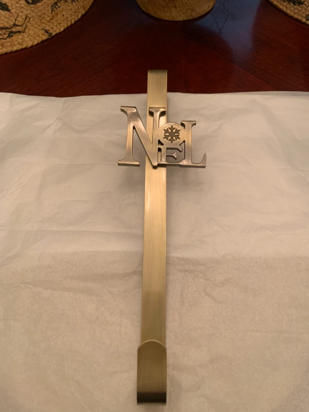 96• Main Intersections are HURONTARIO•STEELES just before downtown Brampton • NEVER USED • This is a metal wreath hanger with a "NOEL" design, often used for Christmas decorations • The "O" in "NOEL" is replaced with a snowflake design • It is a type of over-the-door hanger that can be used to display wreaths, garlands, and other decorations without damaging the doo • Product Type: Wreath hanger • Design: "NOEL" with a snowflake • Material: Metal • Finish: gold, brass or bronze finish • Size• ‘15” INCHES • Peel Village Area