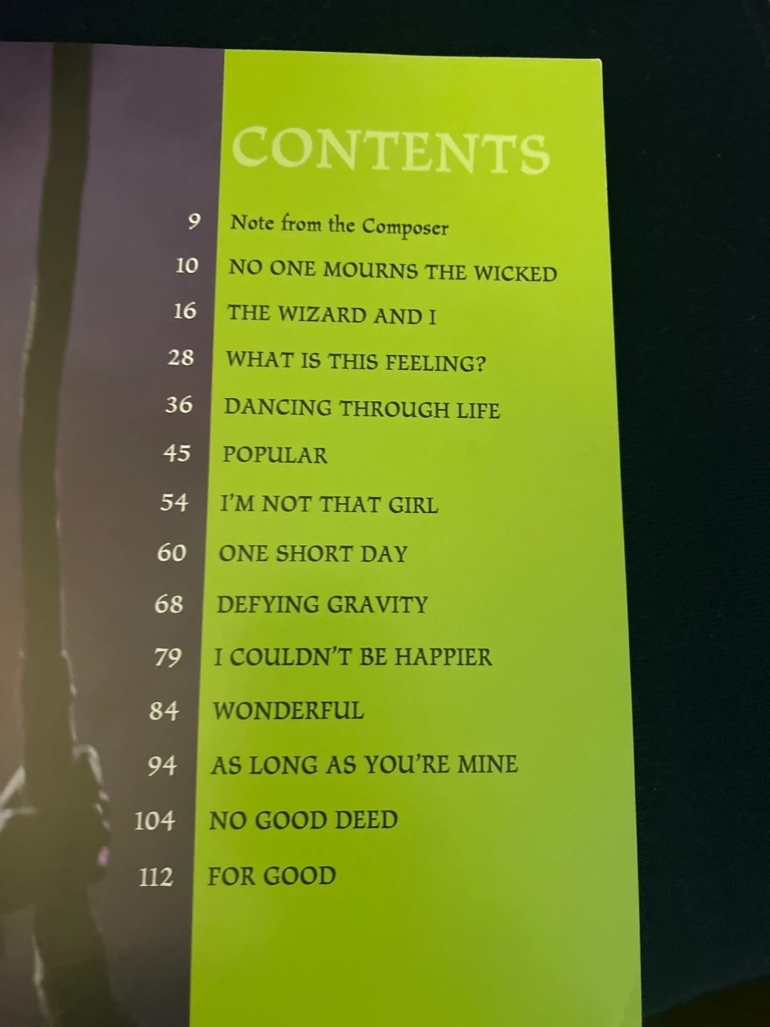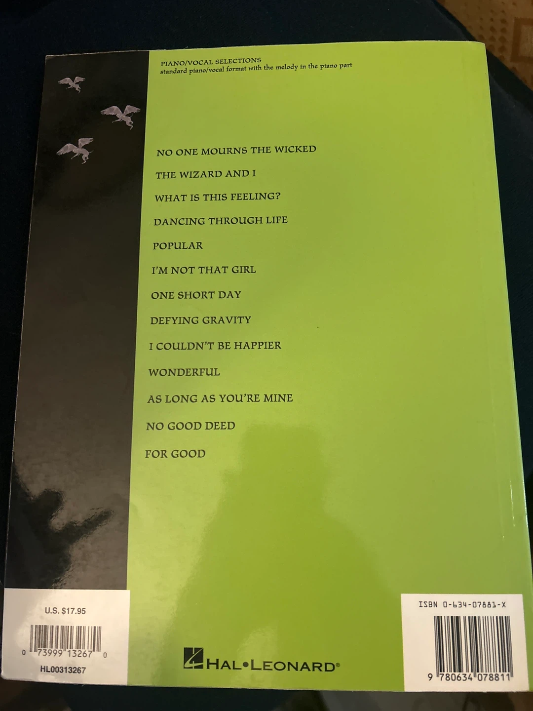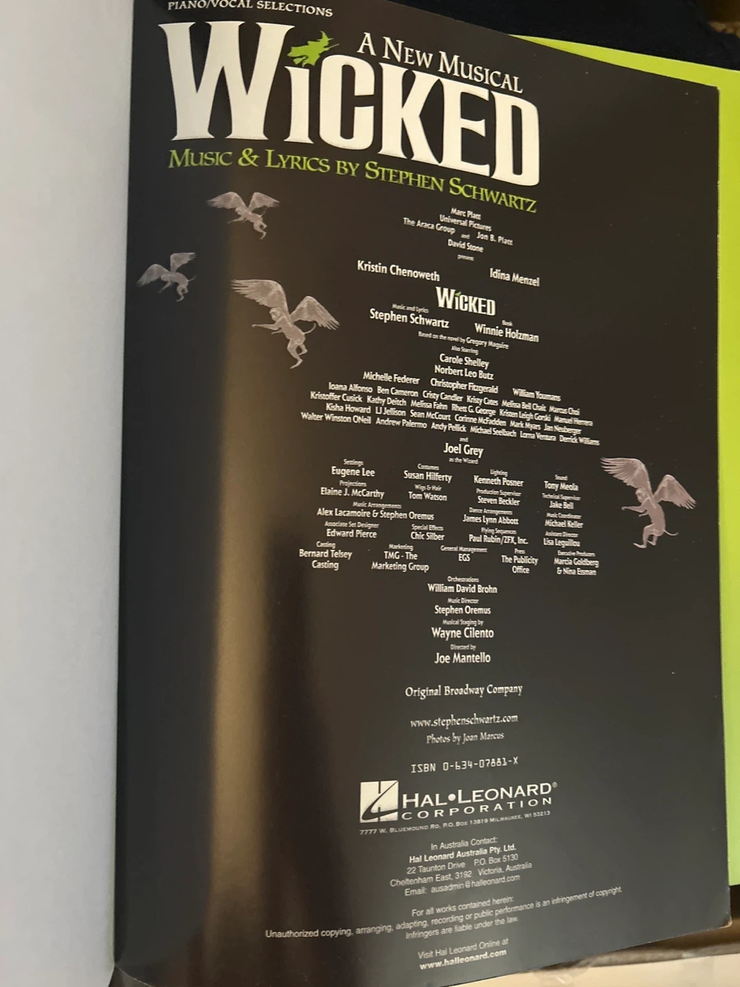 Selling a piano/vocal selections book for the musical Wicked! It includes music and lyrics by Stephen Schwartz. The book contains piano/vocal selections from the original Broadway company.