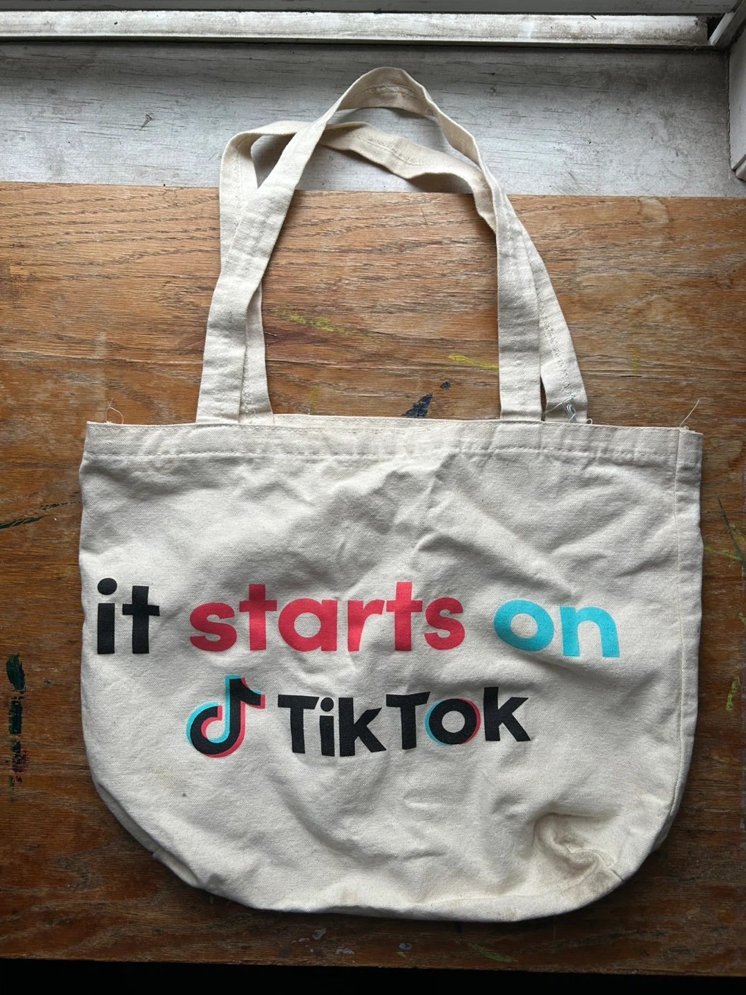 810A tote bag with the TikTok logo. It says 'it starts on TikTok' in black, red, and blue. It's a great lightweight bag for carrying groceries or books
