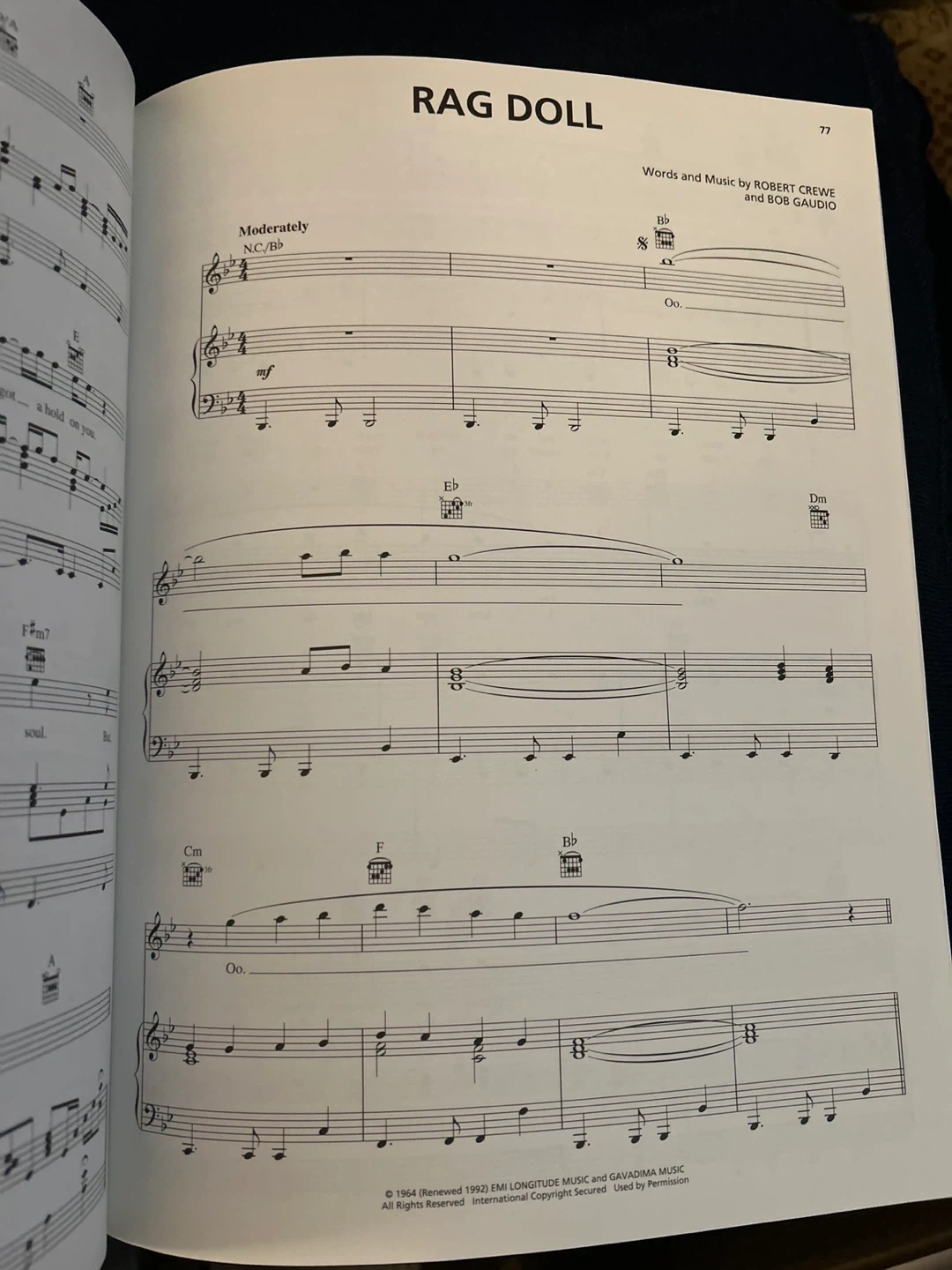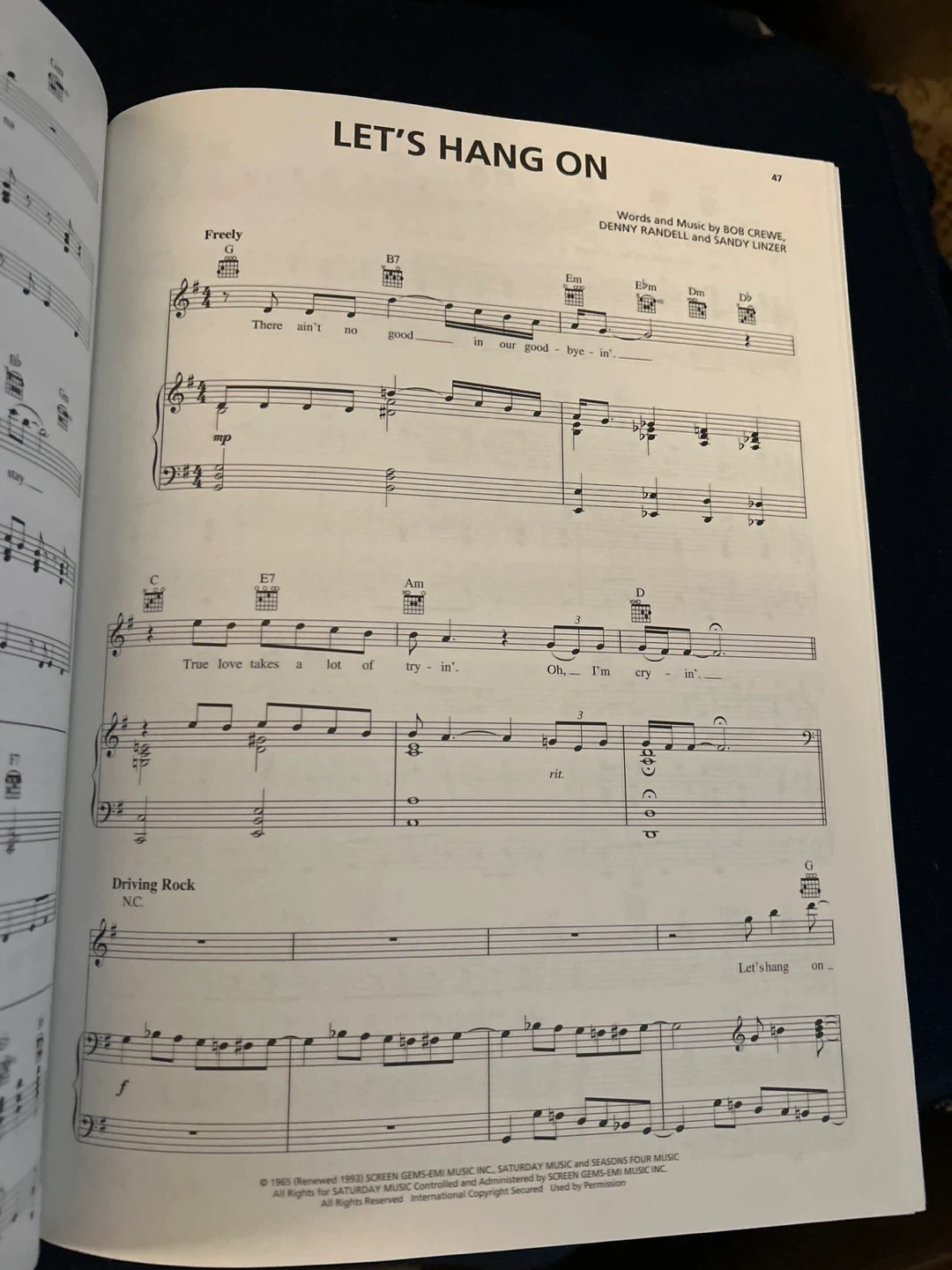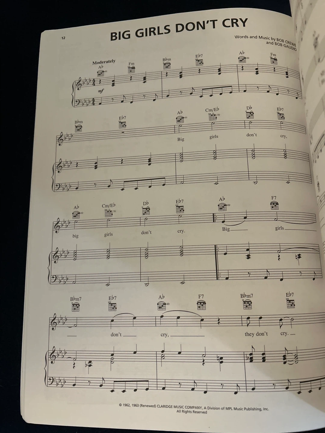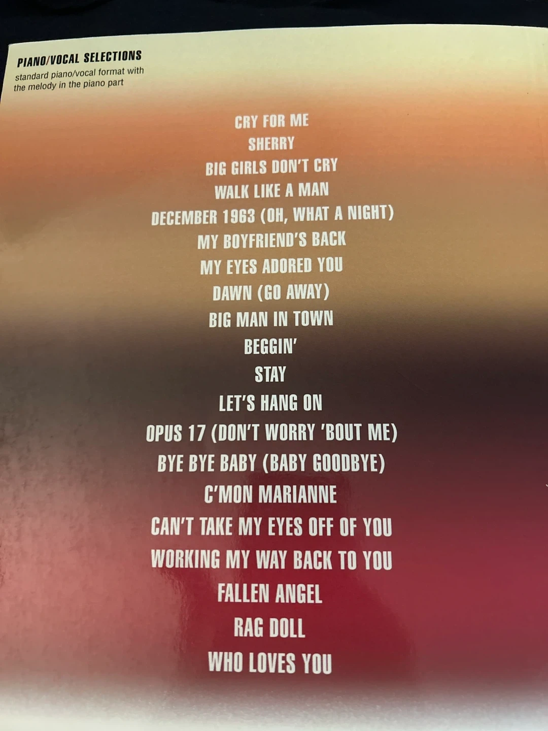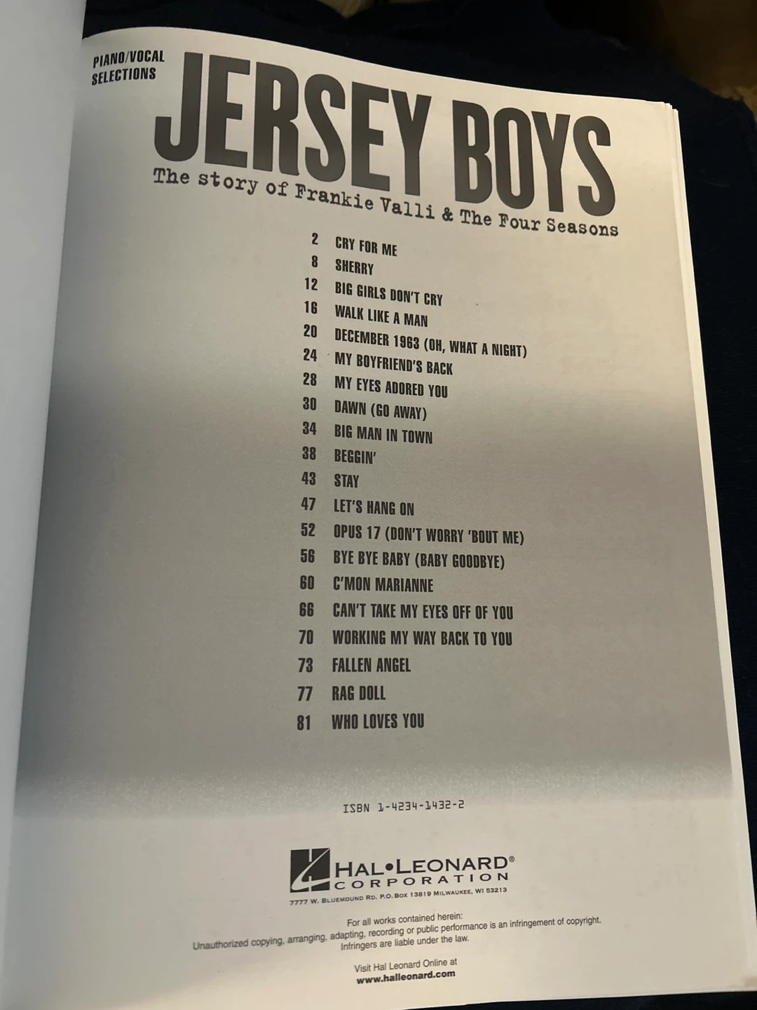 Selling a piano/vocal selections book for Jersey Boys. It includes the story of Frankie Valli & The Four Seasons. The book features piano/vocal format with the melody in the piano part. Songs include: Cry For Me, Sherry, Big Girls Don't Cry, Walk Like A Man, December 1963 (Oh, What A Night), My Boyfriend's Back, My Eyes Adored You, Dawn (Go Away), Big Man In Town, Beggin', Stay, Let's Hang On, Opus 17 (Don't Worry 'Bout Me), Bye Bye Baby (Baby Goodbye), C'mon Marianne, Can't Take My Eyes Off Of You, Working My Way Back To You, Fallen Angel, Rag Doll, and Who Loves You