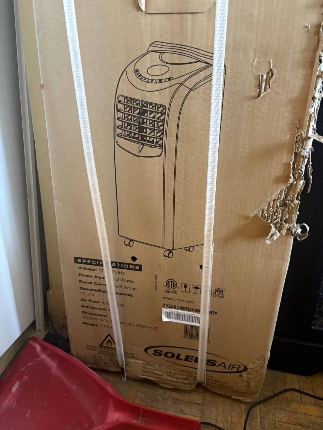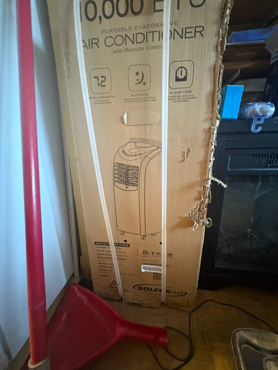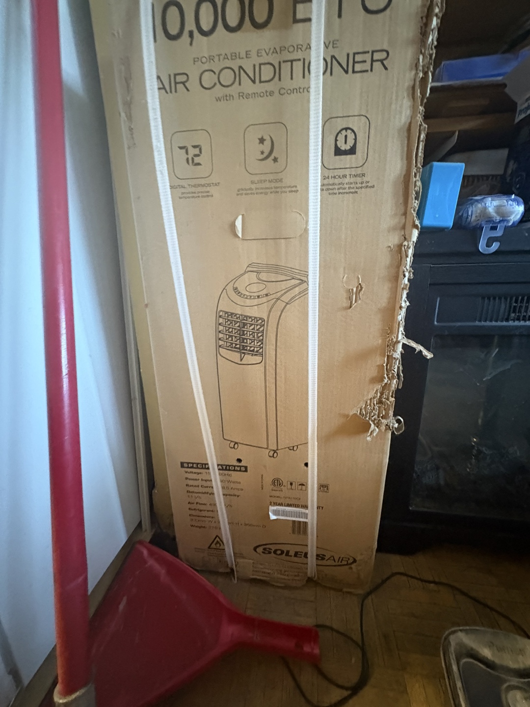 Selling a Soleus Air 10,000 BTU portable evaporative air conditioner with remote control. It features a digital thermostat, sleep mode, and a 24-hour timer. The box includes specifications such as voltage: 120Hz, power input: 950 Watts, rated current: 8.0 Amps, and refrigerant R410A. Weight: 57.8 lbs. Box is scratched up due to my cats but its completely unopened and unused
