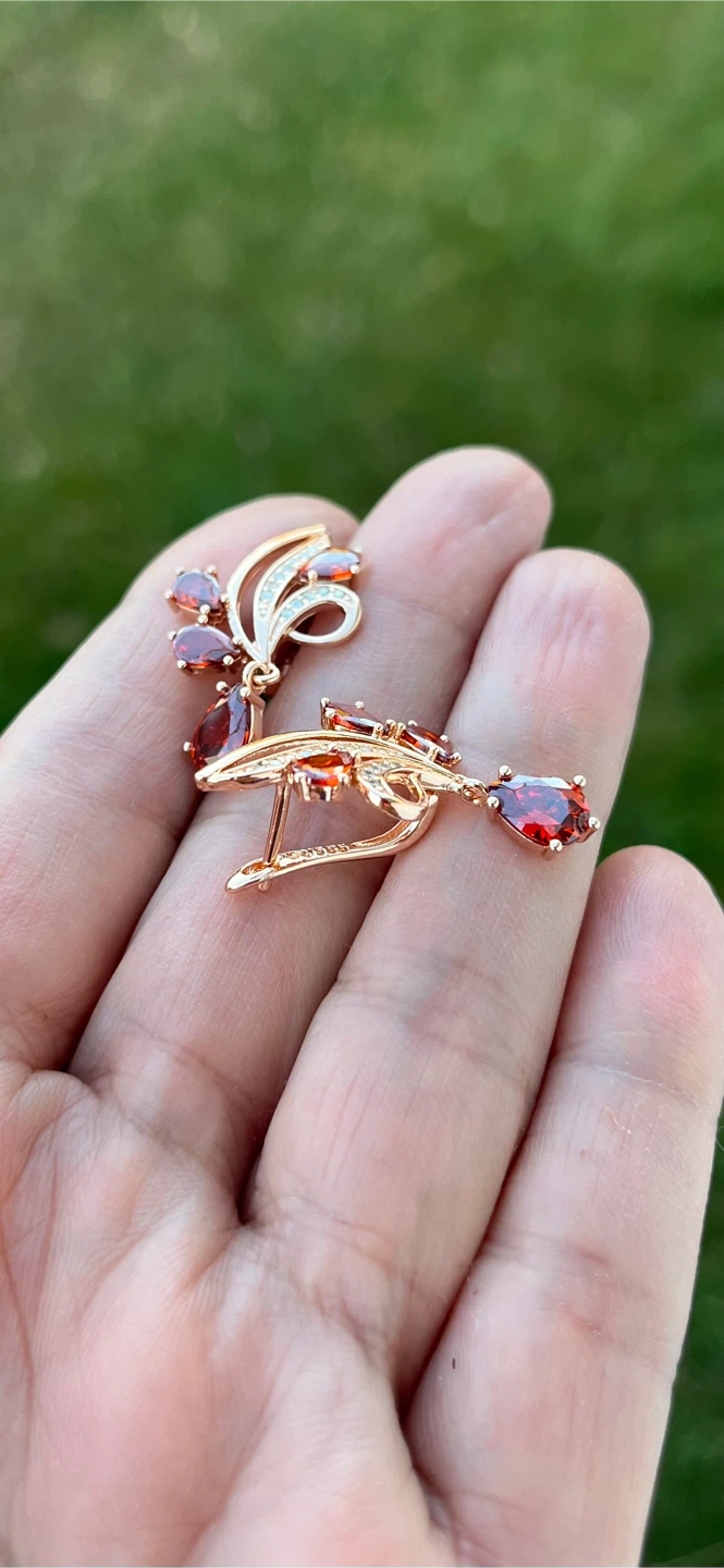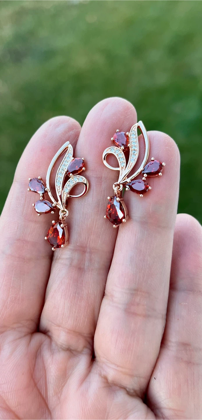 These are a pair of earrings featuring a floral design with red gemstones. They have a gold-tone finish and some clear stone accents. They are new