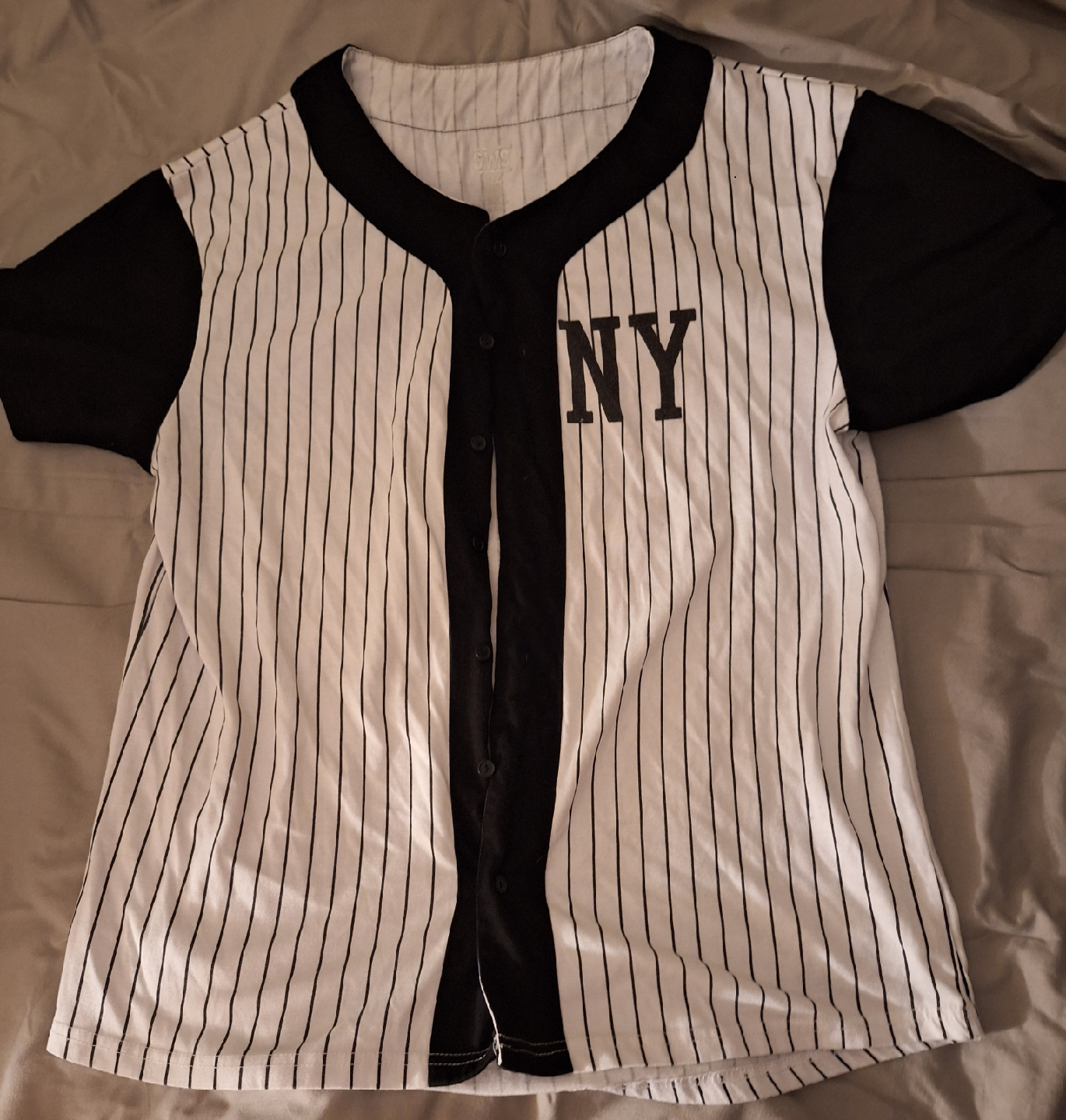 Selling a baseball jersey with an 'NY' logo. It's from the brand SWS and is a size L/G. The jersey features a classic black and white pinstripe design with black sleeves and trim. Perfect for a casual sporty look!