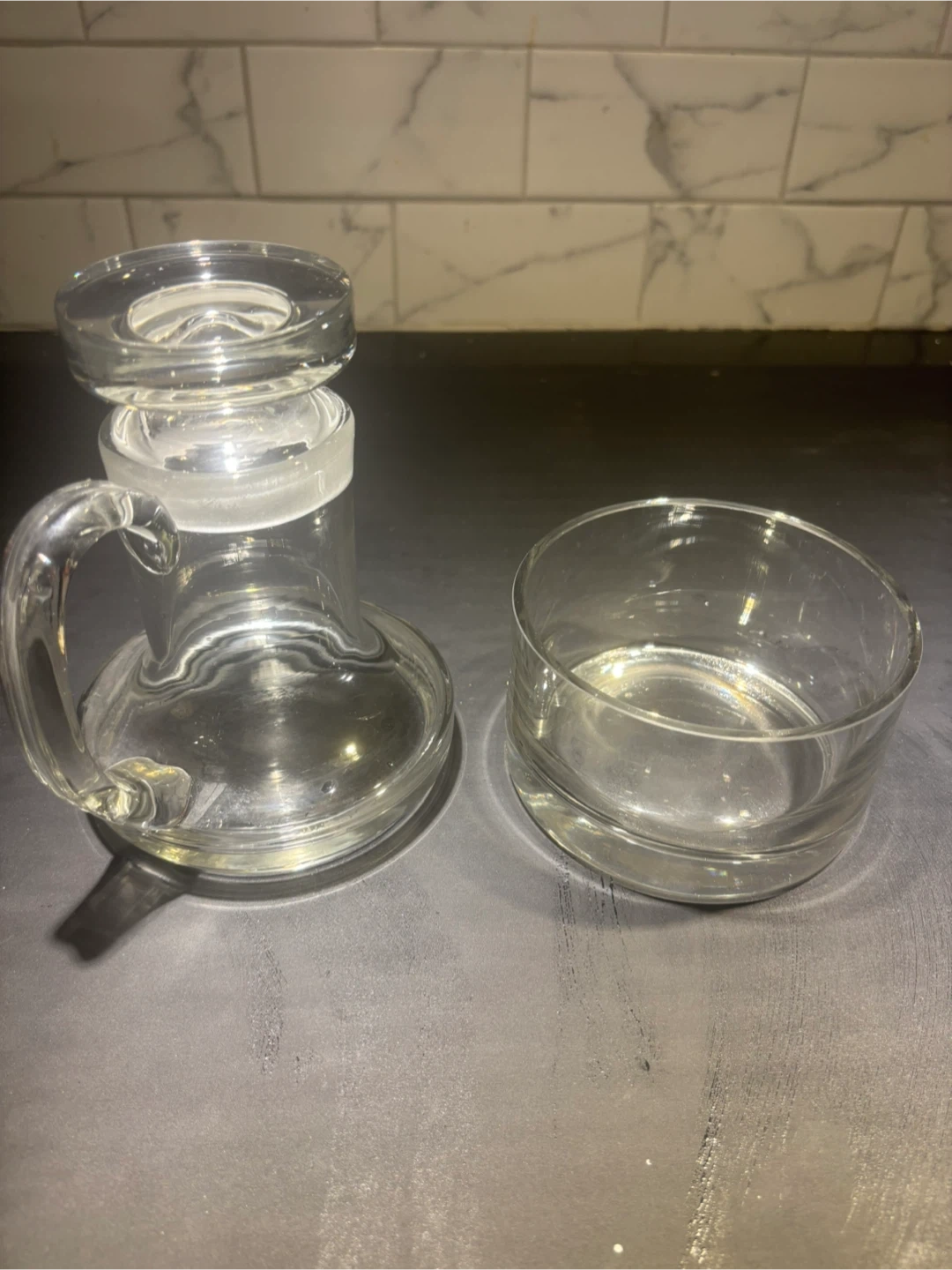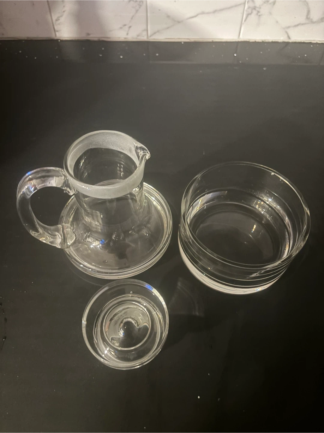 The Vintage Suvertta set is a charming stackable sugar and creamer set made of clear glass with a glossy finish. This medium-sized set includes a creamer and is perfect for all occasions. The Suvertta brand adds a touch of originality to this vintage piece, making it a unique addition to any dining or coffee service. Hand wash only to maintain the beauty of this timeless set. This set is sure to add a touch of elegance to any table setting.