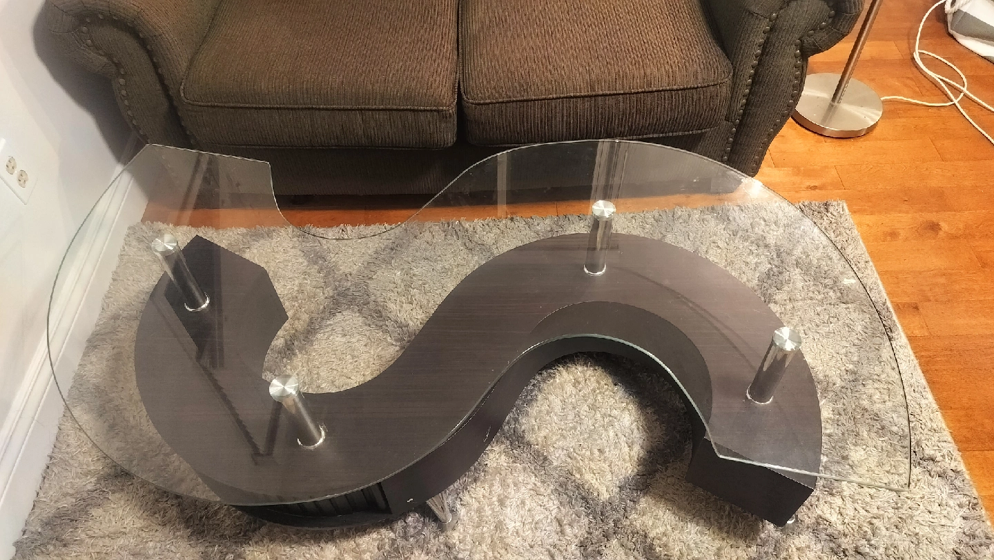 10Selling a unique glass top coffee table with a dark brown base. It's in great shape and would look lovely in any living room!