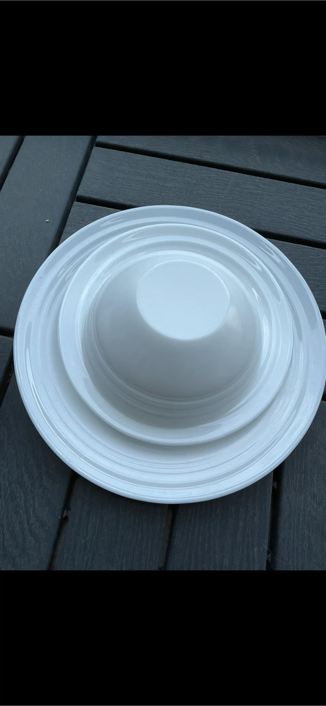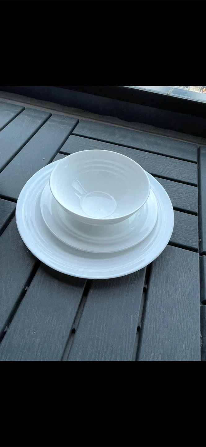 Selling a set of white ceramic dinnerware. Includes plates and bowls. Perfect for everyday use or special occasions! They're in great condition and ready for a new home
