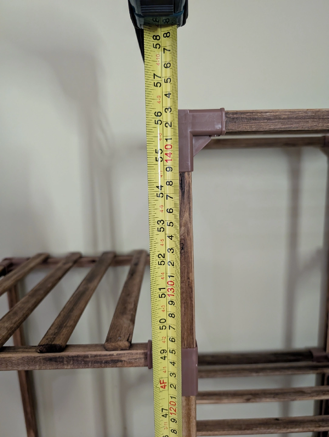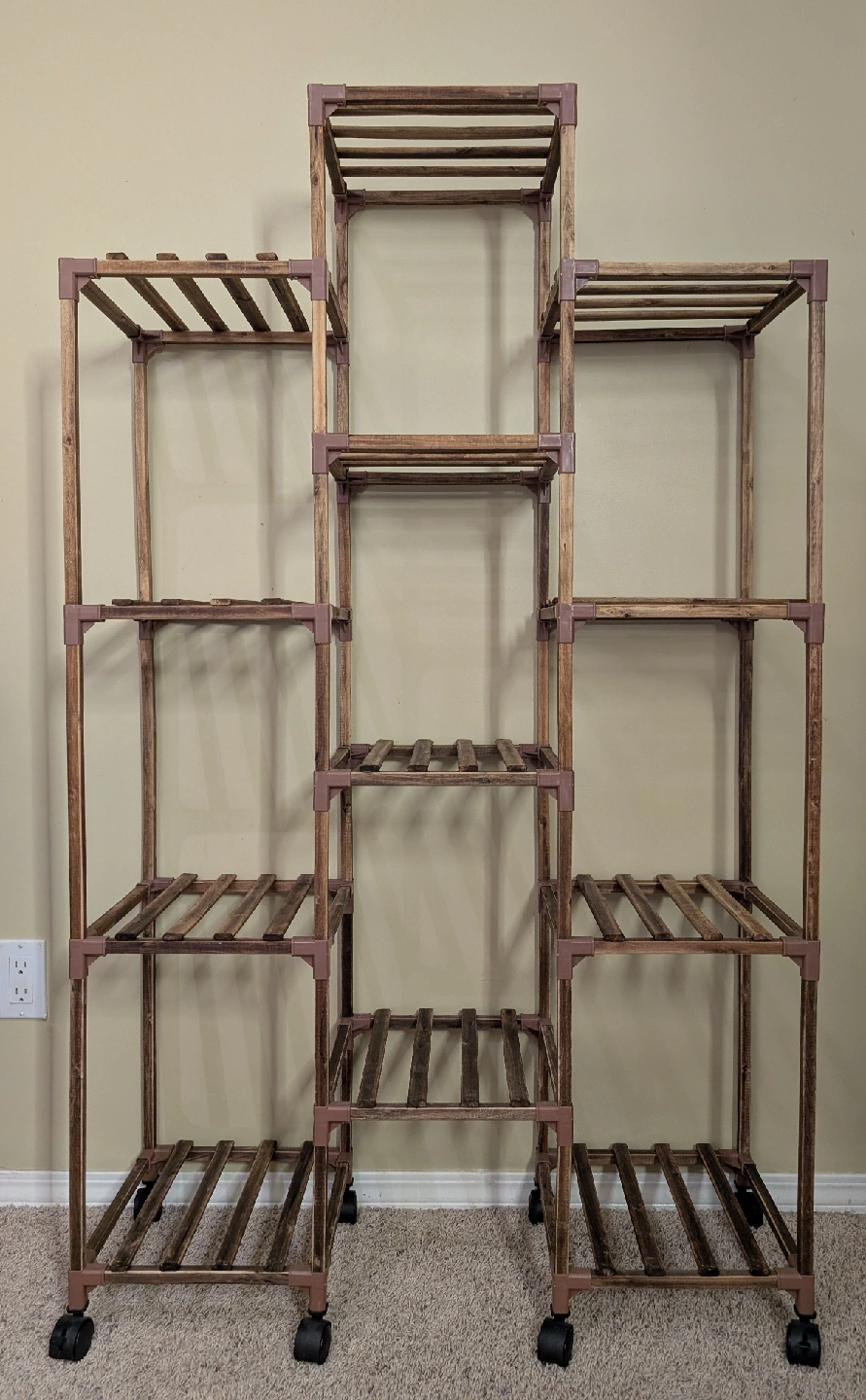 Selling a wooden plant stand! It features multiple tiers and comes with wheels for easy moving. It's perfect for displaying your plants indoors or outdoors. Easy to disassemble and reassemble. The height is approximately 58 inches.