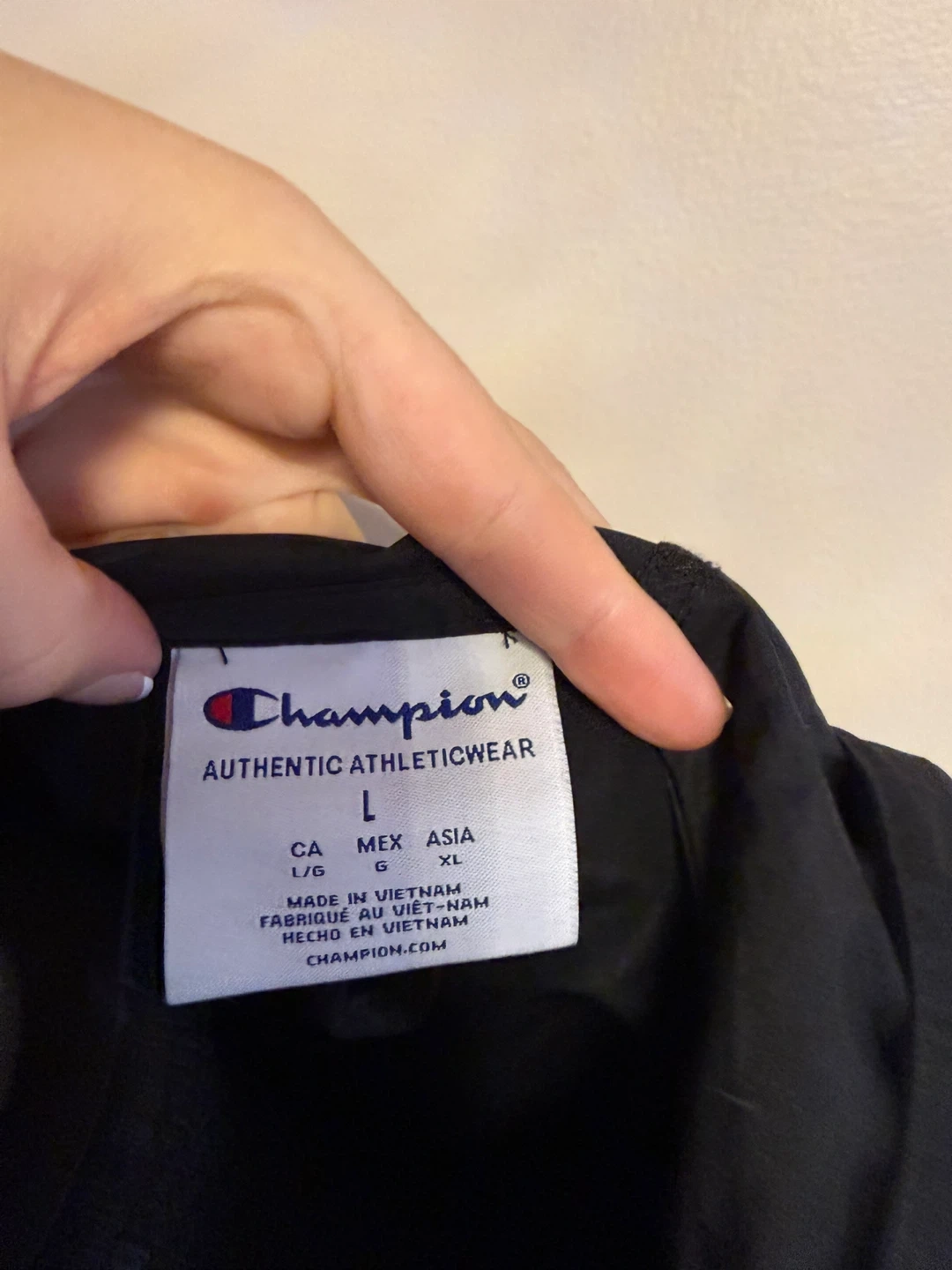65Selling a Champion black windbreaker in size large! It features the Champion logo on the chest and sleeve.
