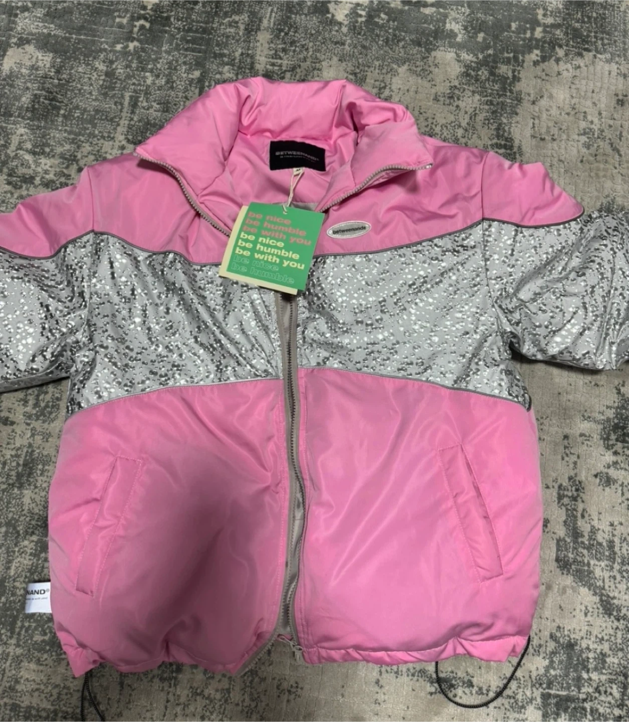 Selling a cute BETWEENAND puffer jacket! It's pink and silver, and size medium. Perfect for keeping warm and stylish!