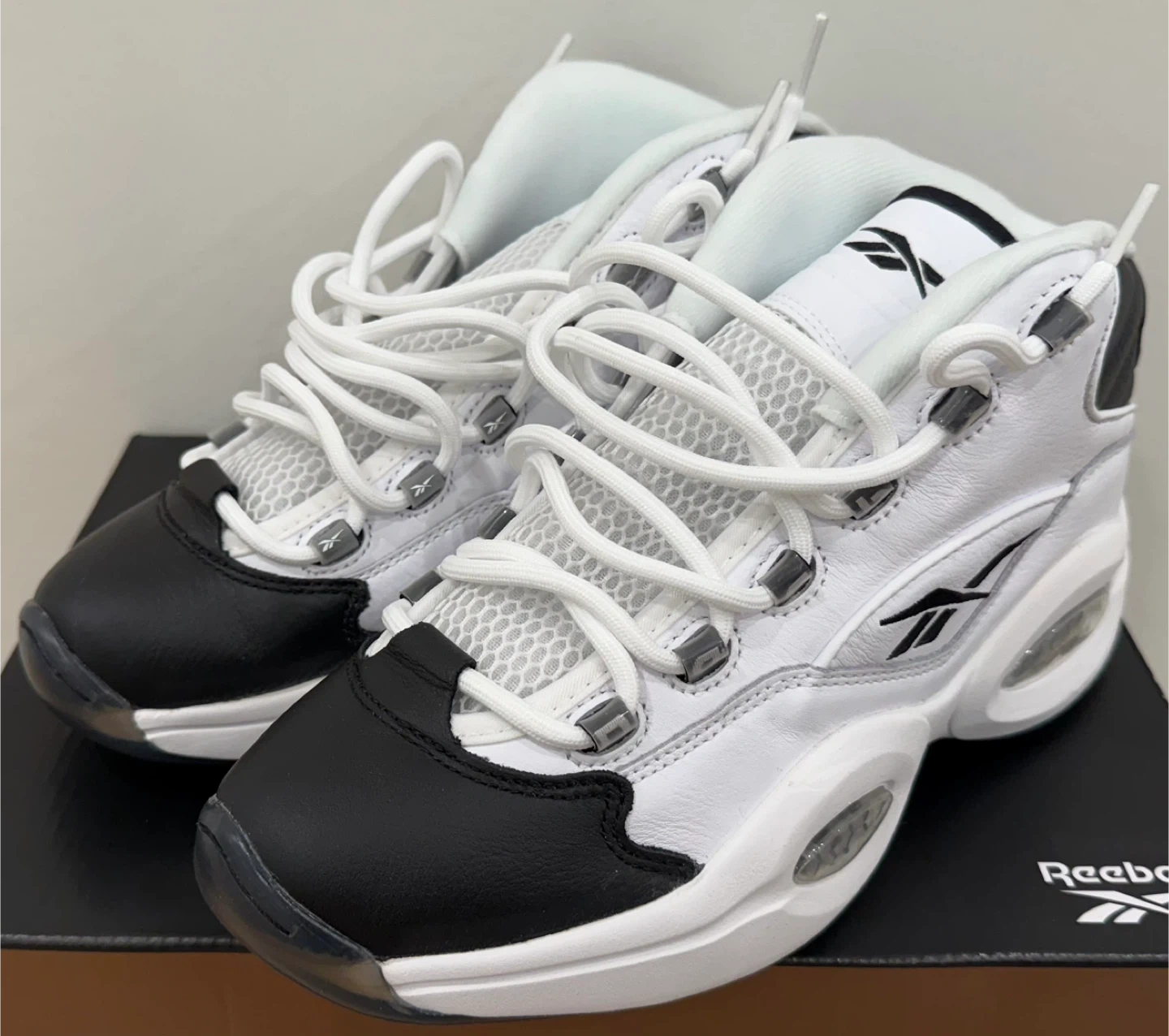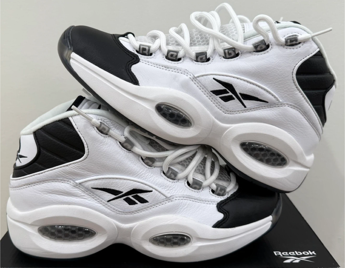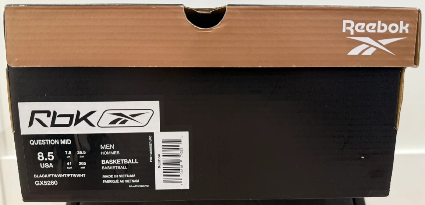 26*Worn Once to Try On - Scuff/Crease on Right Toe* Elevate your footwear collection with the Reebok Question Mid Why Not Us, a sneaker that pays homage to the legendary Allen Iverson. These mid-top athletic shoes feature a striking white and navy blue colourway that's sure to turn heads and provide a vibrant addition to any outfit. With a design that's both timeless and contemporary, they're a perfect blend of style and function. Crafted for comfort and performance, the Reebok Question Mid sneakers are a part of the iconic Reebok Question product line. This pair, released in 2021, boasts the same durability and support that the brand is known for. Ideal for men who appreciate a sneaker that offers both a classic look and modern comfort.