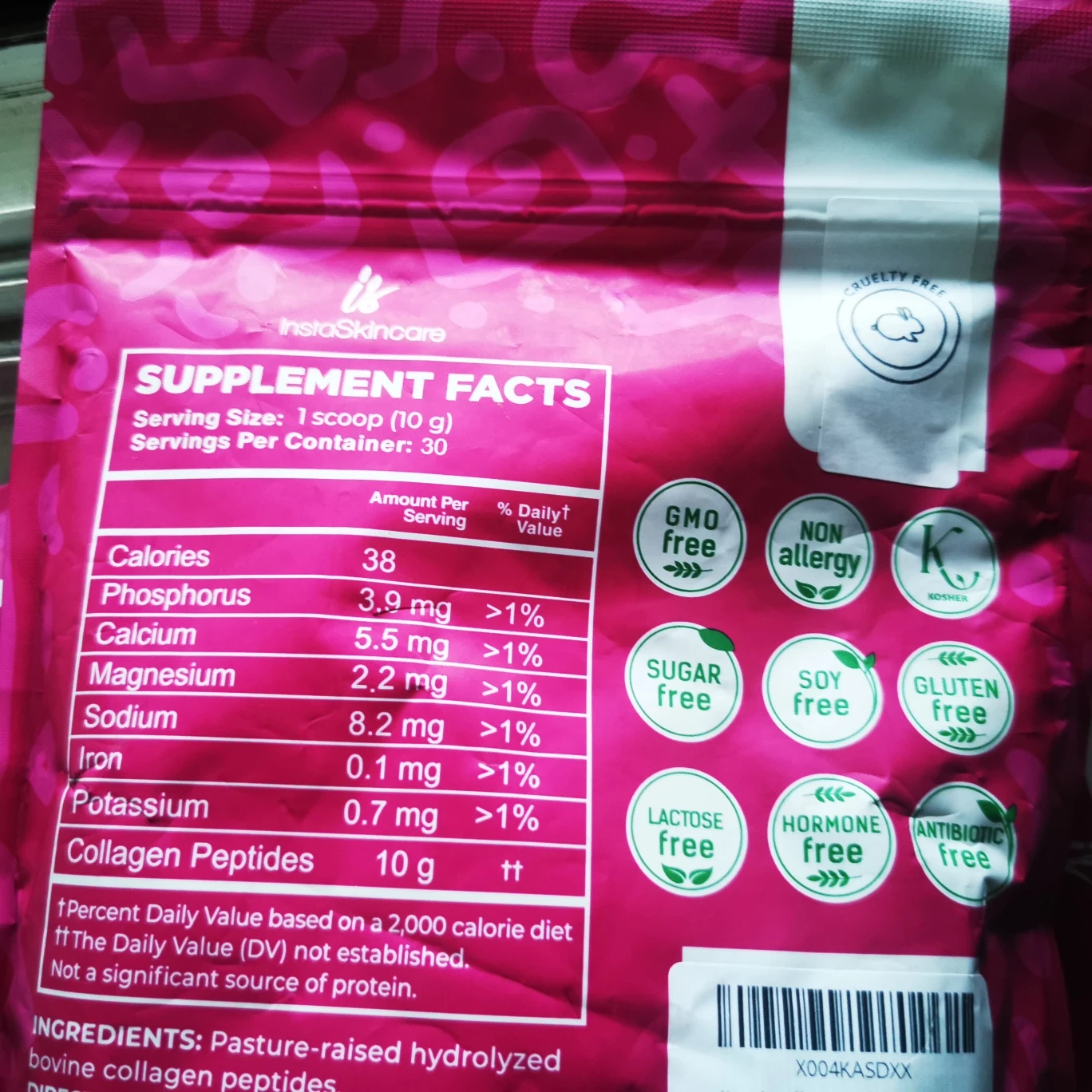 This is InstaSkincare Collagen Peptides, an unflavored powder dietary supplement. It's grass fed and gluten-free. It comes in a 10.58 oz (300g) package and is made in the USA. This supplement is for hair, nails, skin and joints