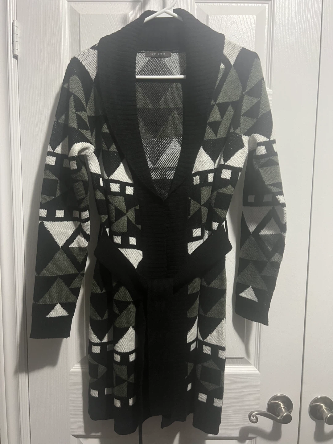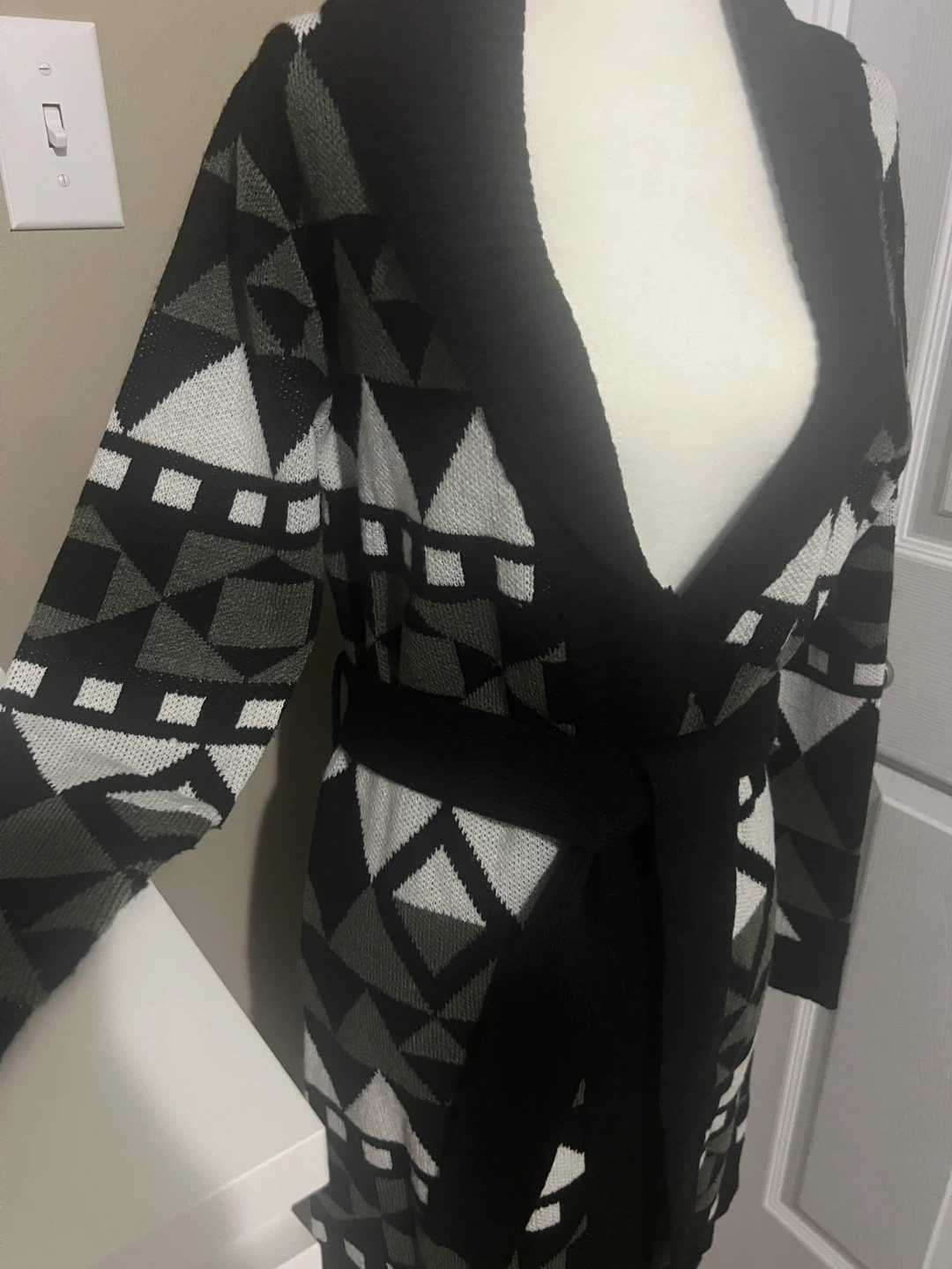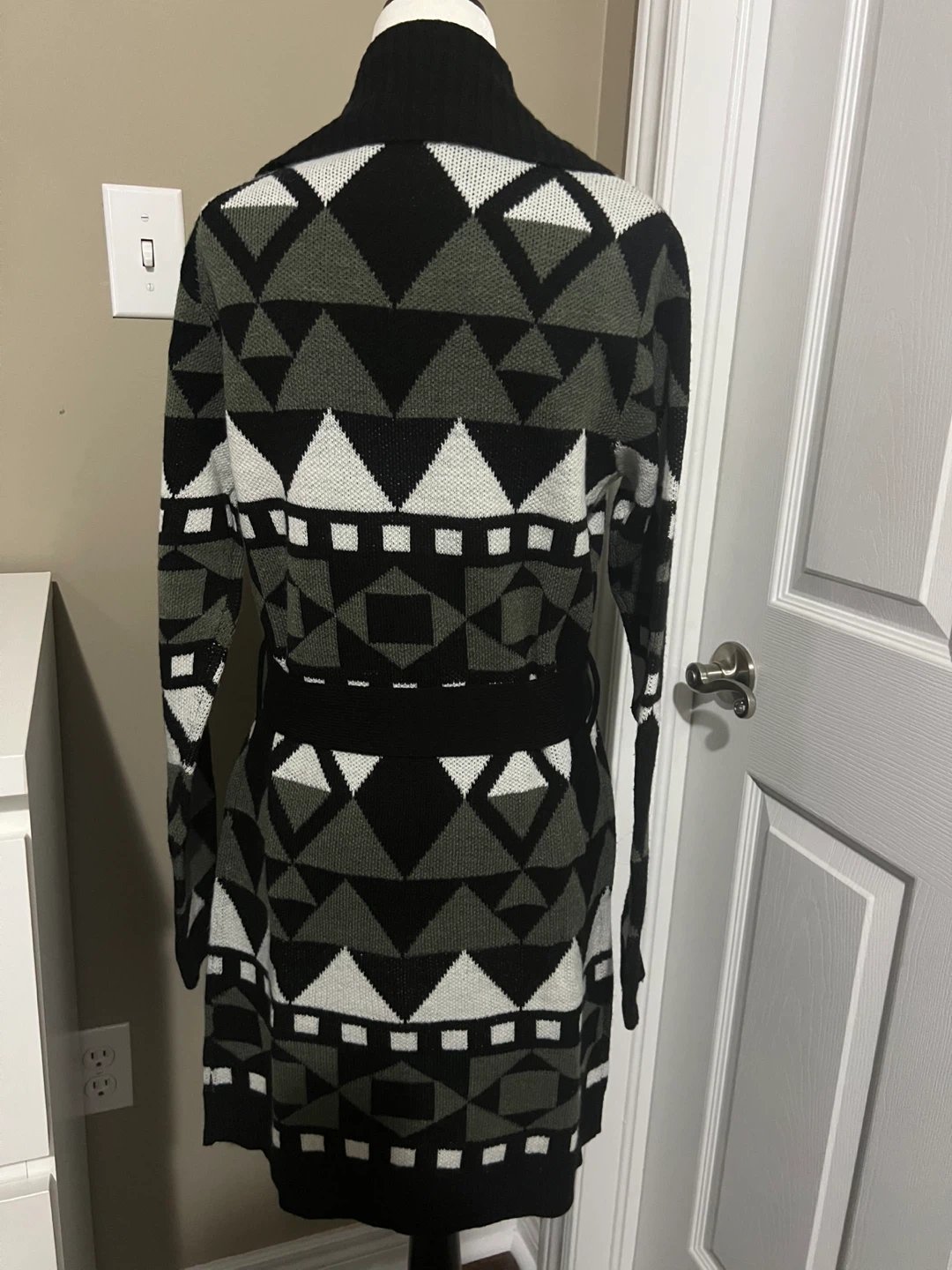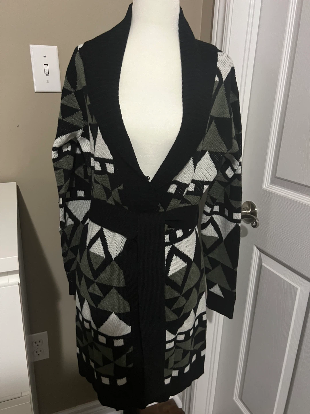 Selling a cardigan with a geometric pattern in black, white, and olive green. It's in great condition and would be a cozy addition to your wardrobe! Perfect for layering!