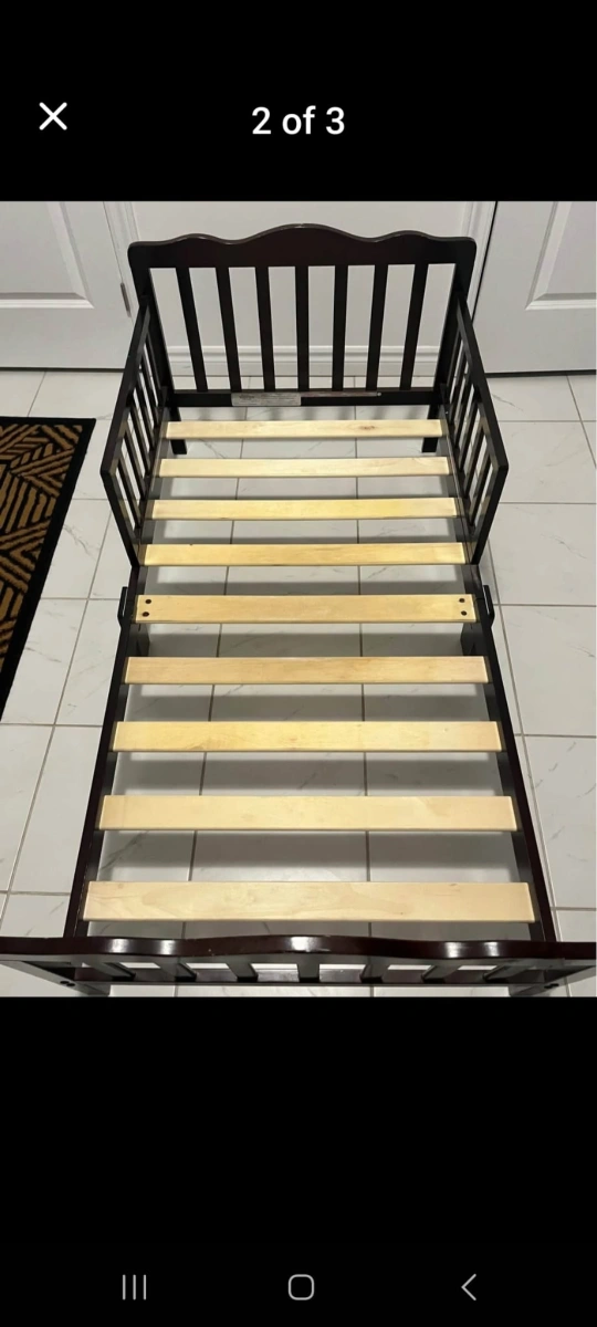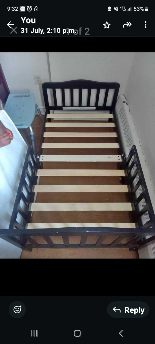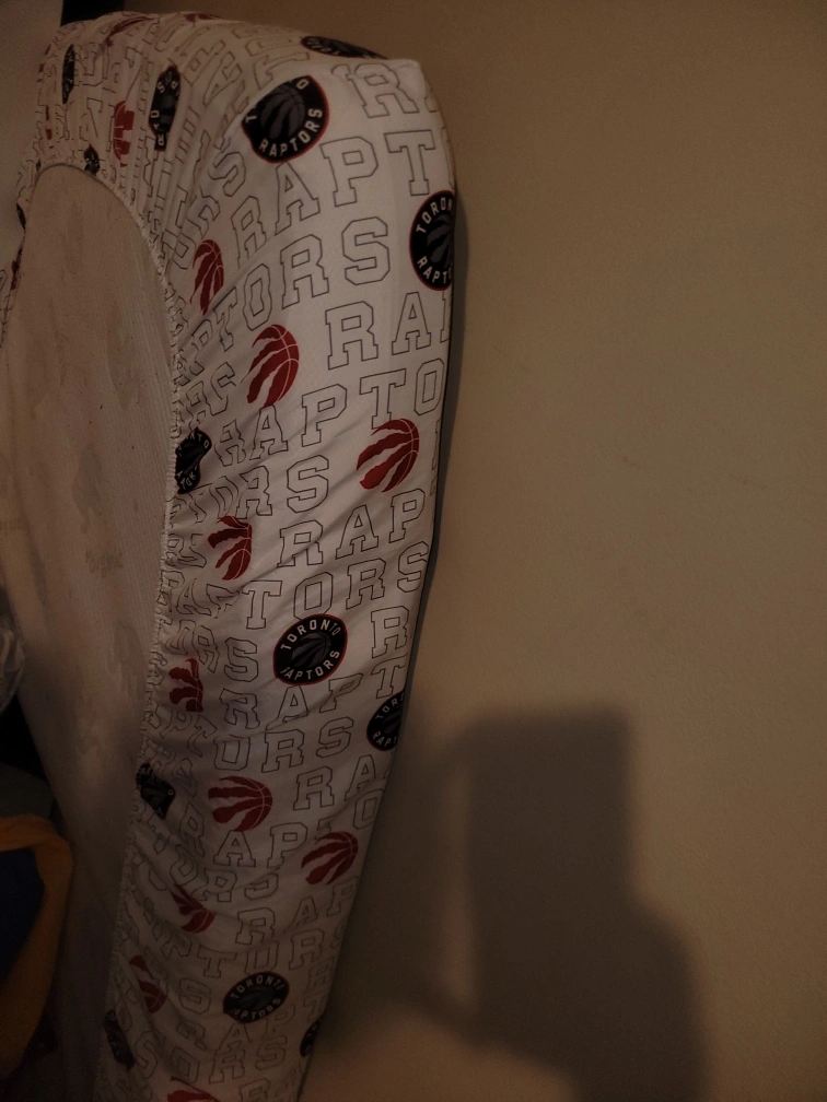 Selling a toddler bed frame, perfect for transitioning your little one to their own bed! Also included is a Toronto Raptors fitted sheet for a fun, sporty touch and 2 other sheets elephant and stars
