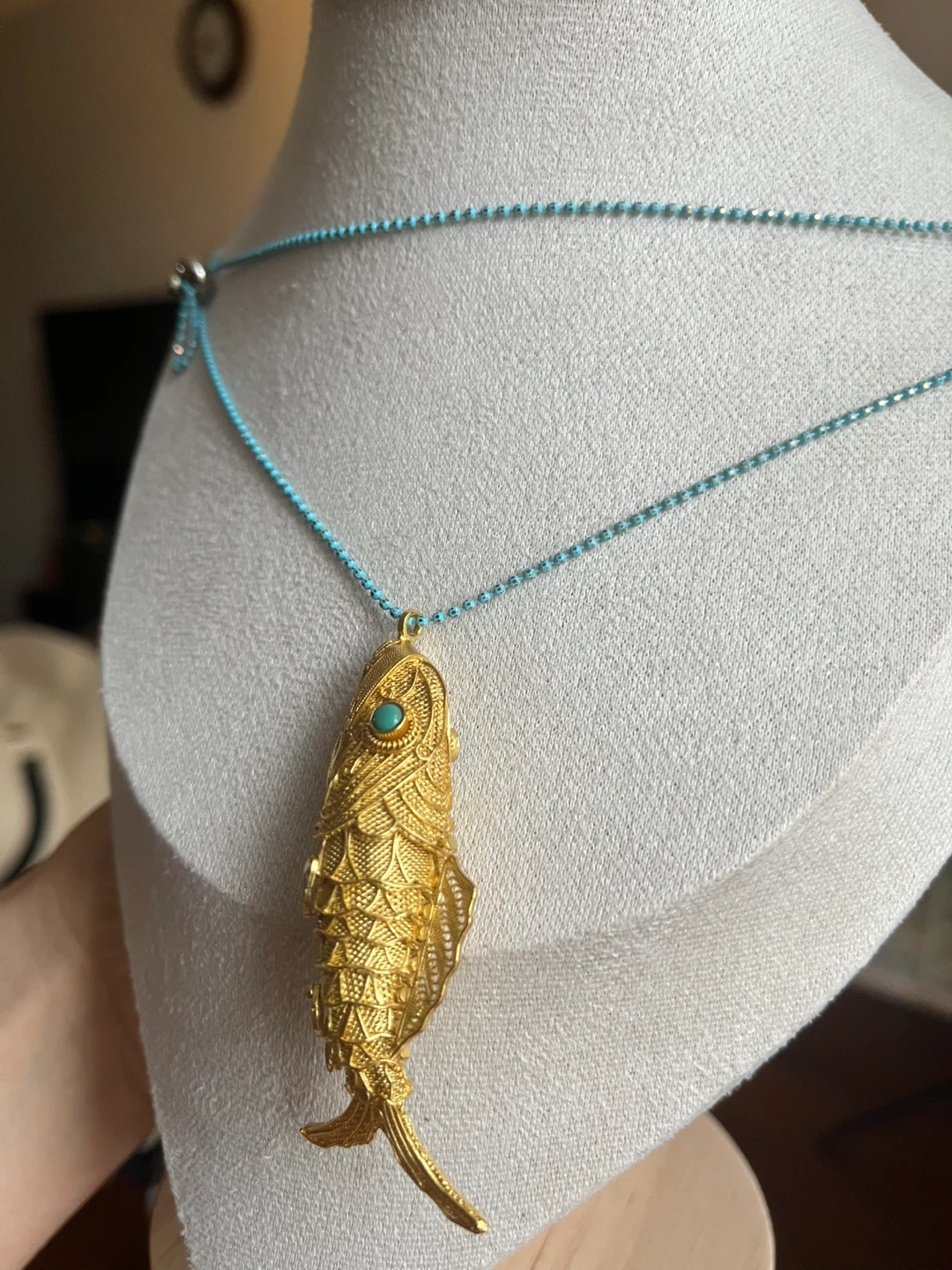 This is a very pretty gold plating fish pendant necklace. It has a turquoise stone on the head of the fish. The chain is a light blue beaded chain. Filigree inlay is a precious intangible cultural heritage of China