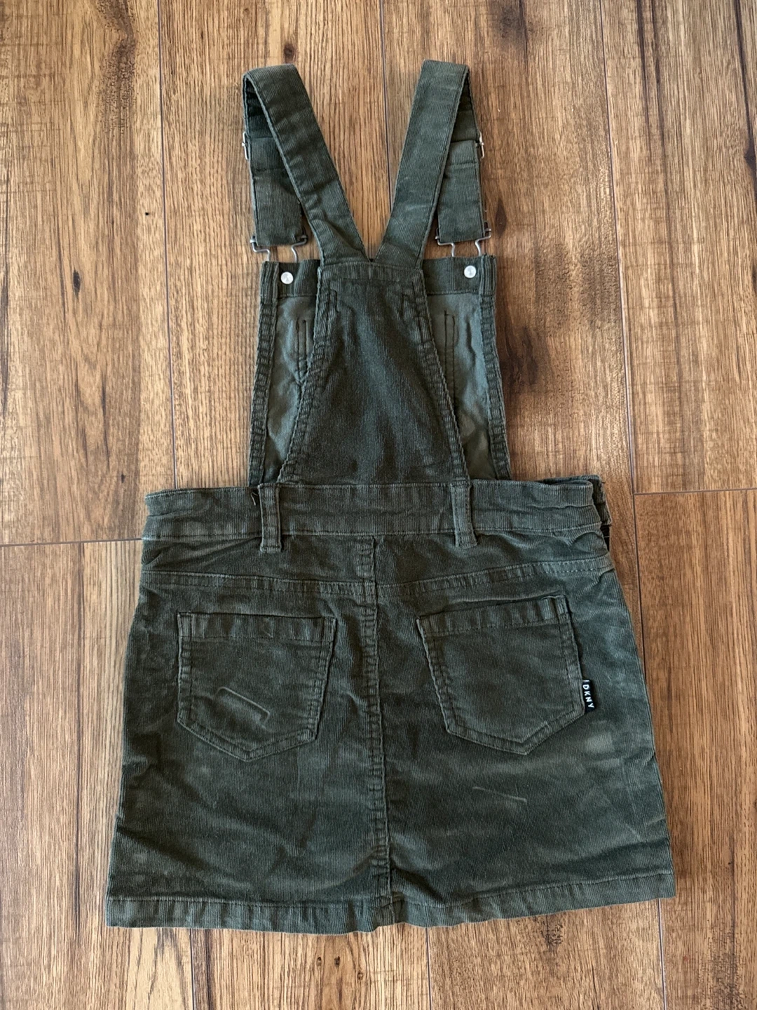80Here's a cute DKNY jumper dress! It's an olive green colour and made of corduroy material. Size 5 girl