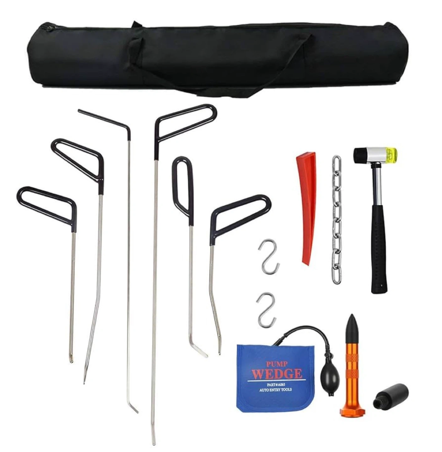 TORNEW auto dent repair tool set. It includes various tools for dents such as picks, wedges, and a hammer. Perfect for anyone needing to repair vehicles dents. Comes with a carrying bag for easy storage and transport
