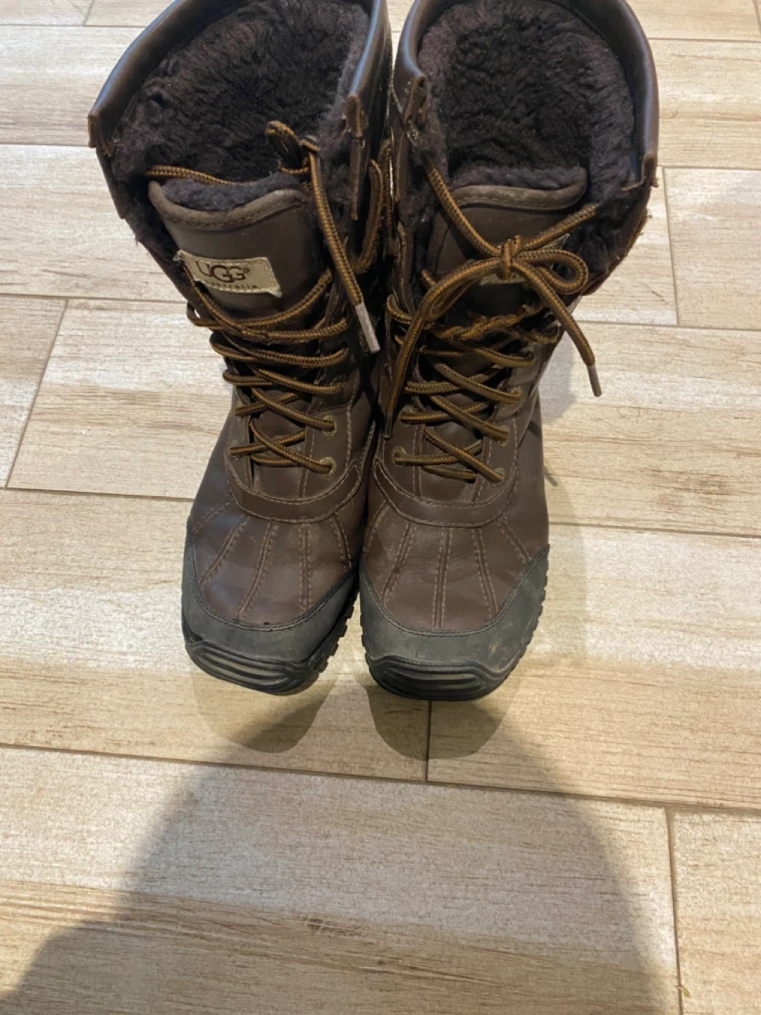 Please read: Selling a pair of original well loved Adirondack UGG winter boots in brown leather. They are a size 7 in US sizing. These boots are perfect for keeping your feet warm during the cold Canadian winters. The soles have Vibram for extra grip. They are in used condition but have some life left to them.
