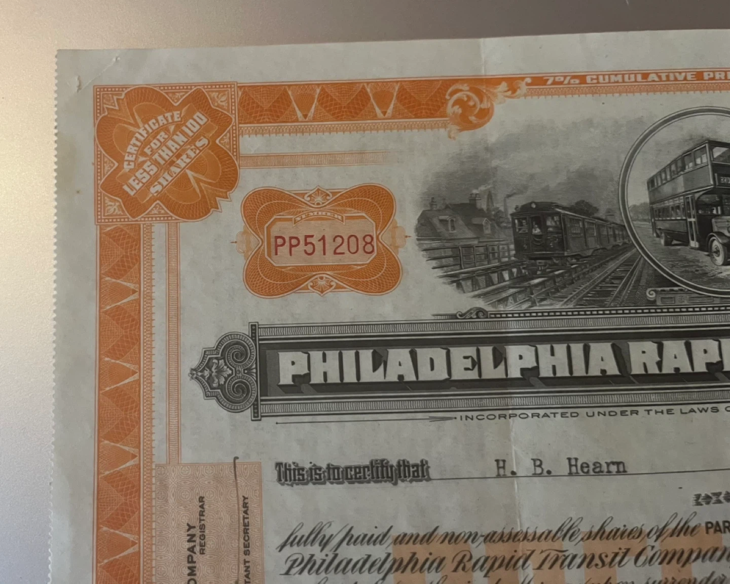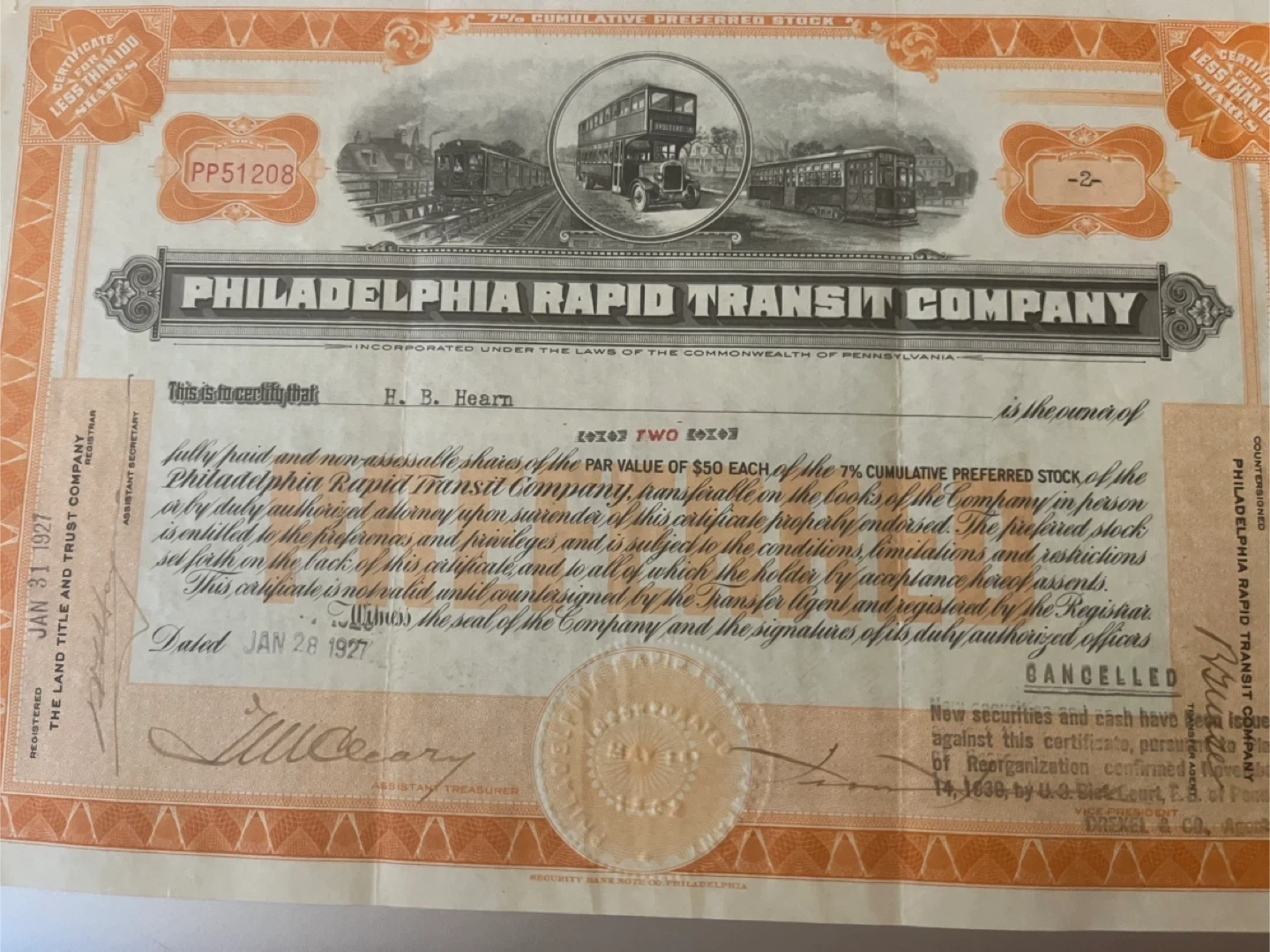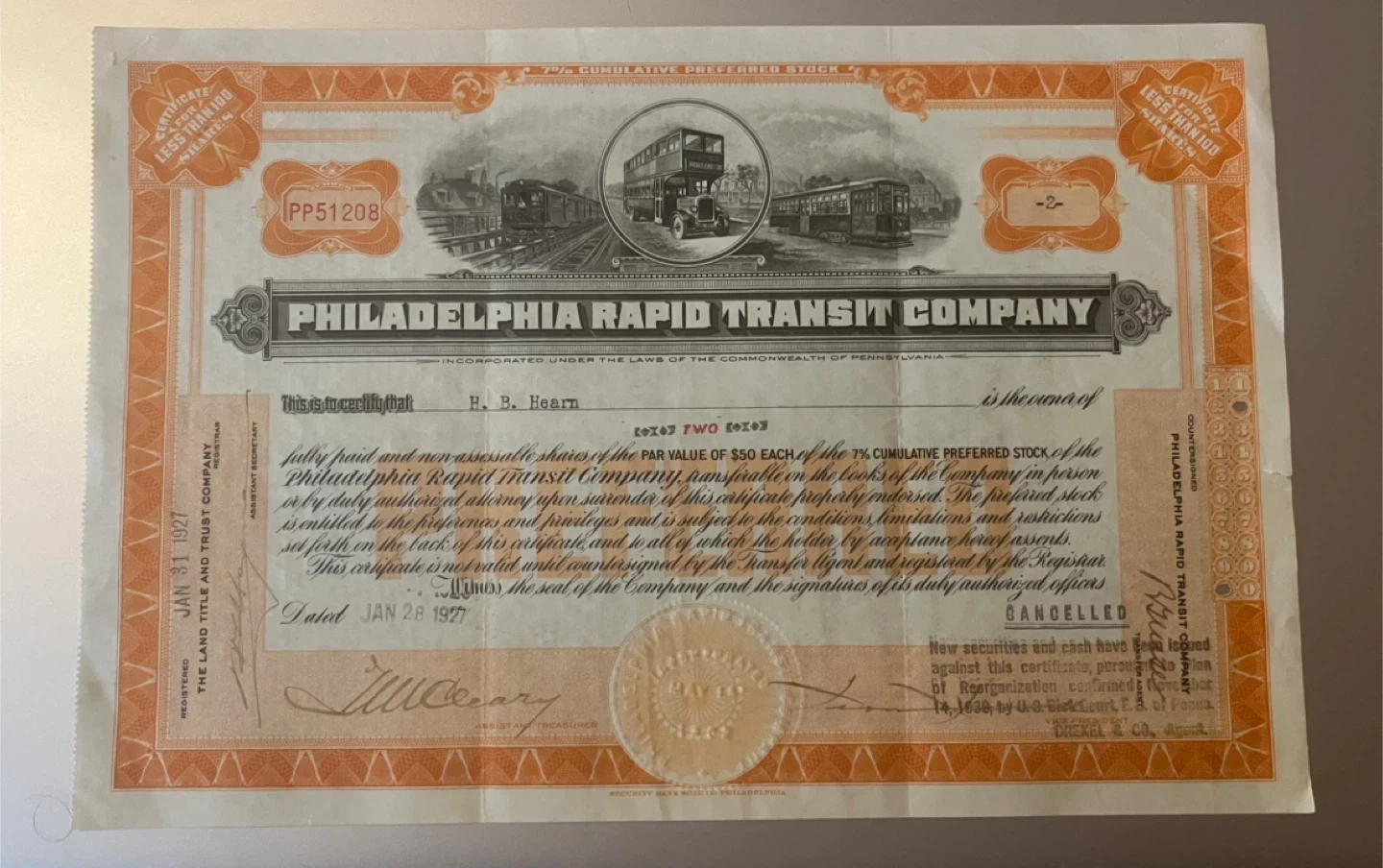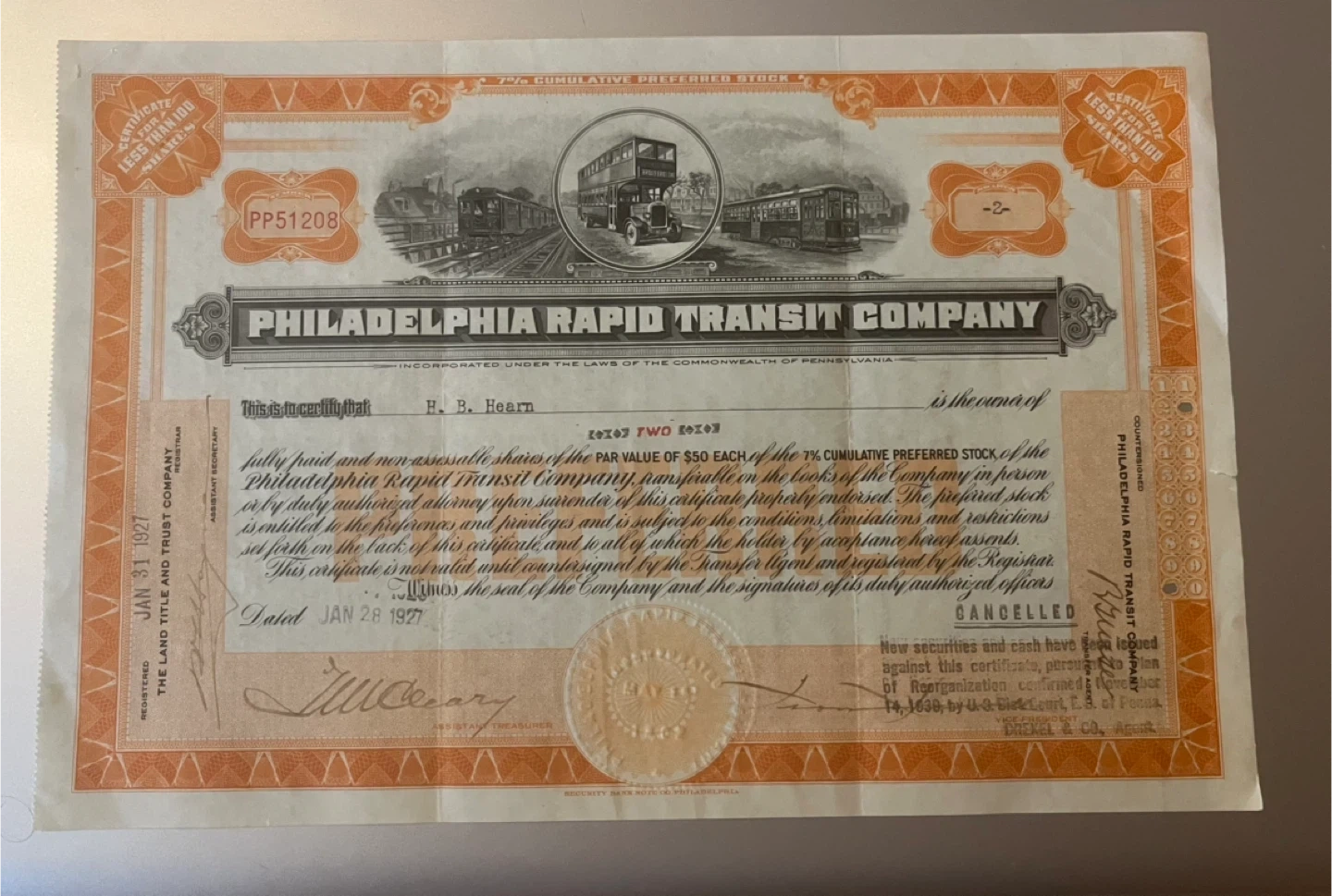 208Selling a vintage stock certificate from the Philadelphia Rapid Transit Company. Dated January 28, 1927, it's a piece of history! The certificate represents 7% Cumulative Preferred Stock with a par value of $50. A unique collectible for history buffs or stock certificate enthusiasts