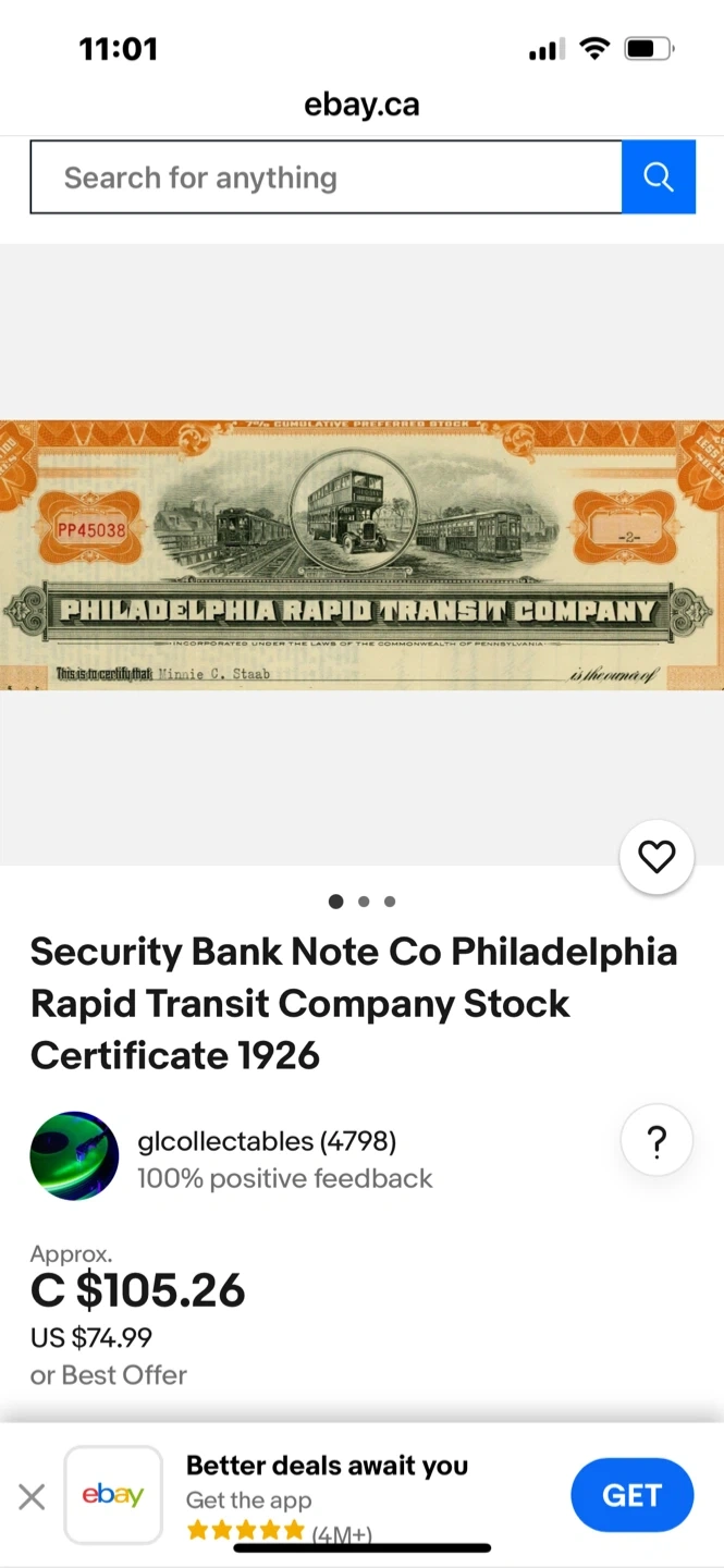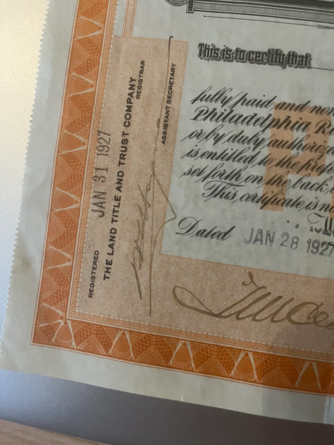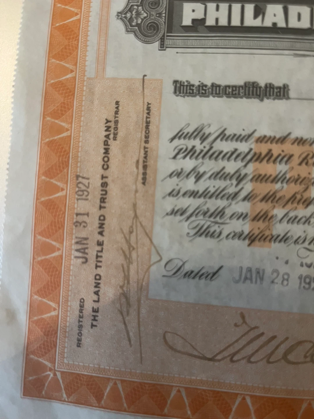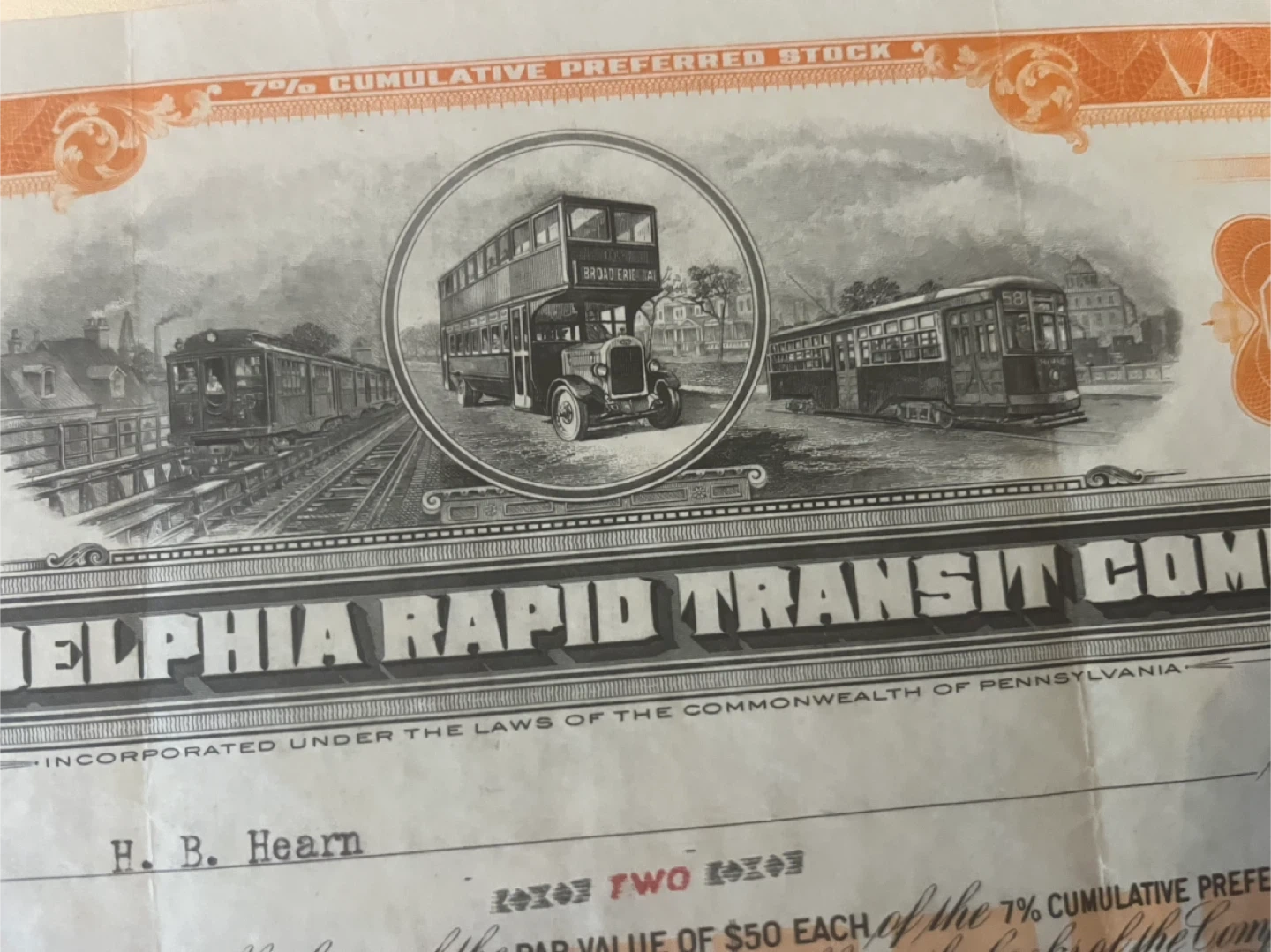 208Selling a vintage stock certificate from the Philadelphia Rapid Transit Company. Dated January 28, 1927, it's a piece of history! The certificate represents 7% Cumulative Preferred Stock with a par value of $50. A unique collectible for history buffs or stock certificate enthusiasts
