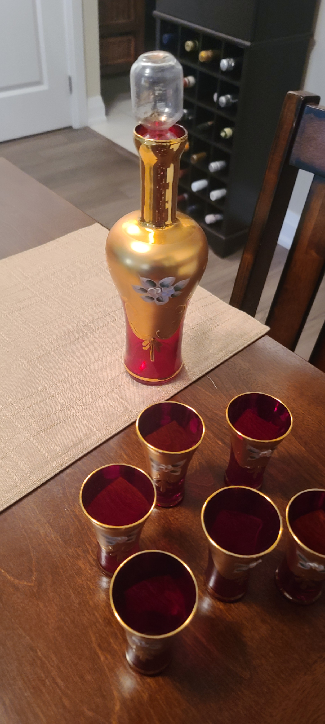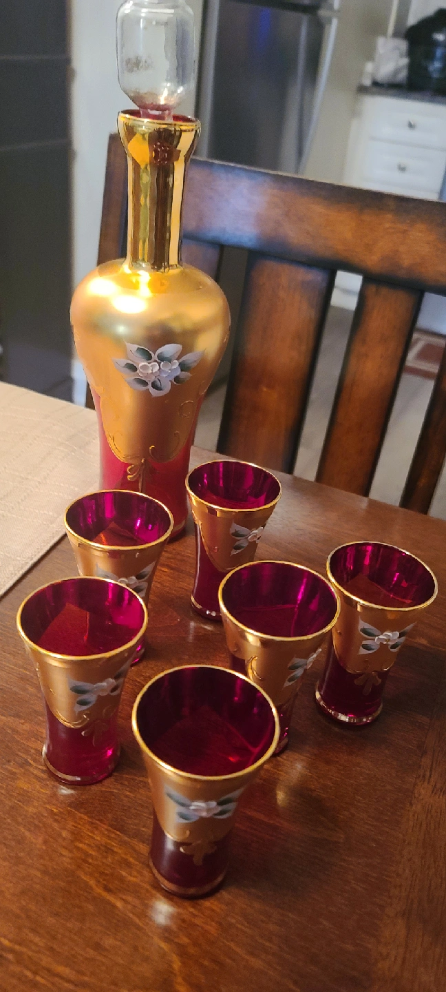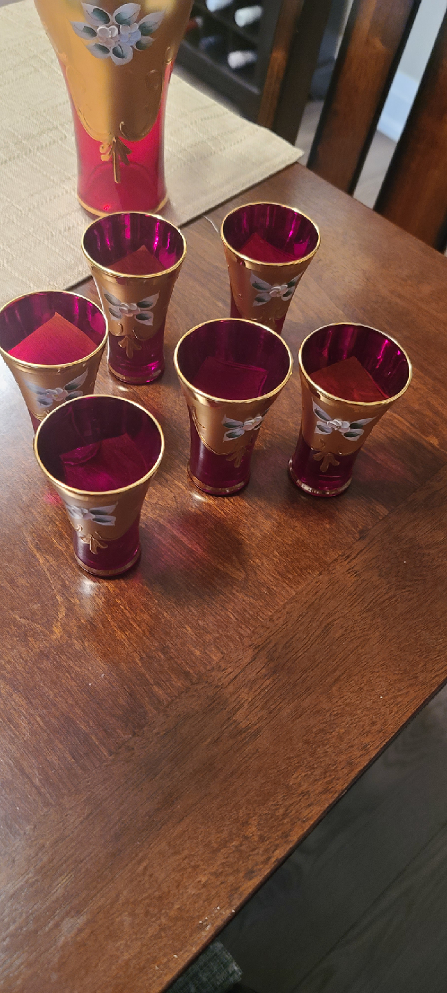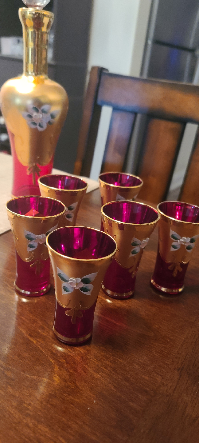 Beautiful Murano vintage decanter set with six matching glasses! The set is a lovely red and gold colour with a floral design. Perfect for adding a touch of elegance to your home bar or dining table