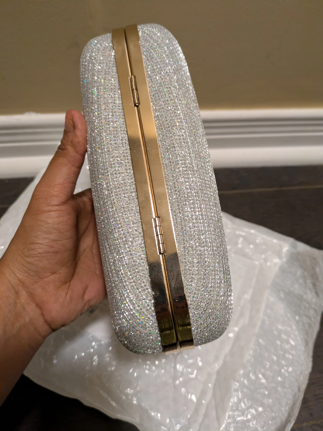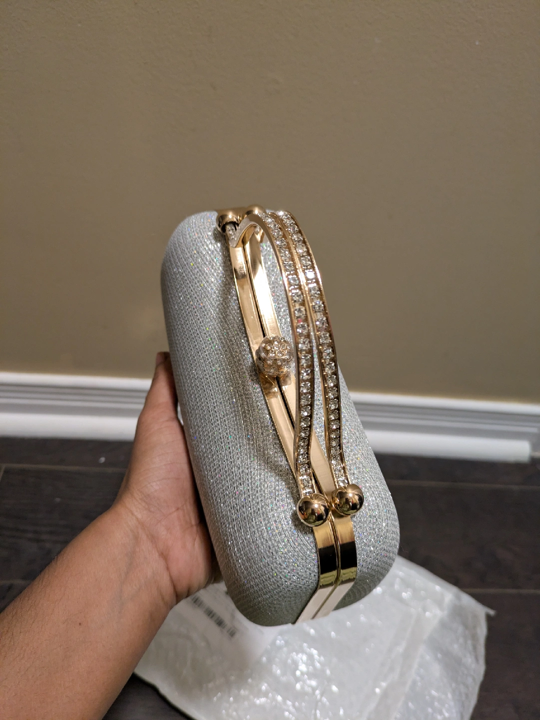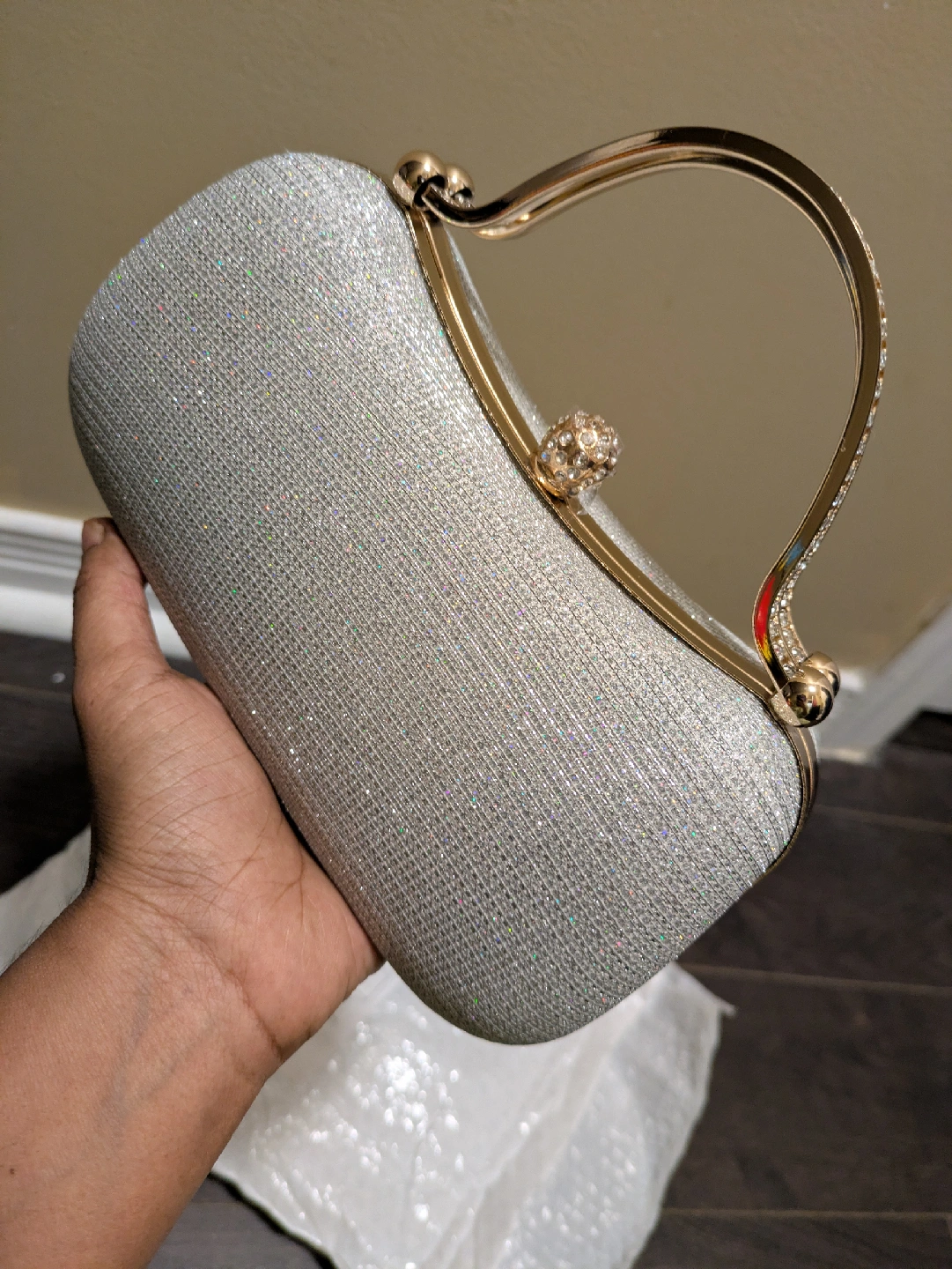 16Selling a beautiful silver glitter evening clutch. It's in great condition and perfect for a special occasion! The clutch features a gold-tone handle adorned with rhinestones, adding a touch of elegance. It's a stylish accessory to complete your evening look