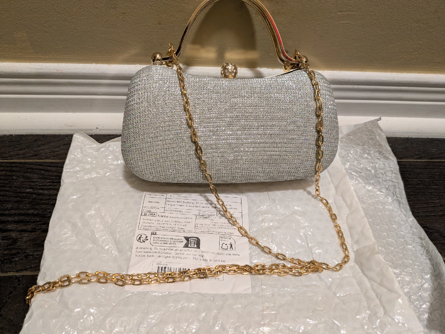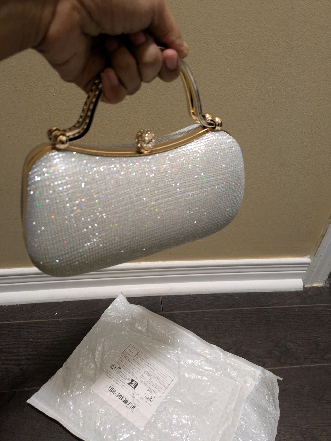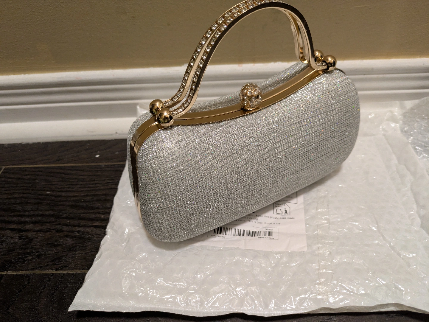 16Selling a beautiful silver glitter evening clutch. It's in great condition and perfect for a special occasion! The clutch features a gold-tone handle adorned with rhinestones, adding a touch of elegance. It's a stylish accessory to complete your evening look