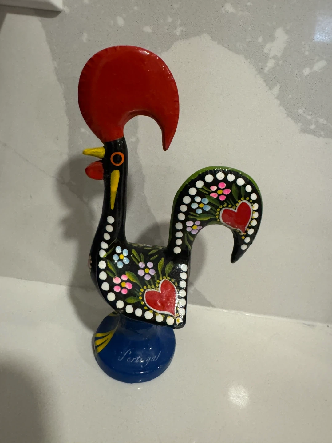 Selling a charming Portuguese rooster figurine! It's a colorful and decorative piece with a traditional design. The figurine has a black body adorned with floral patterns and hearts, a red crest, and stands on a blue base with 'Portugal' inscribed on it. Perfect for adding a touch of Portuguese culture to your home decor
