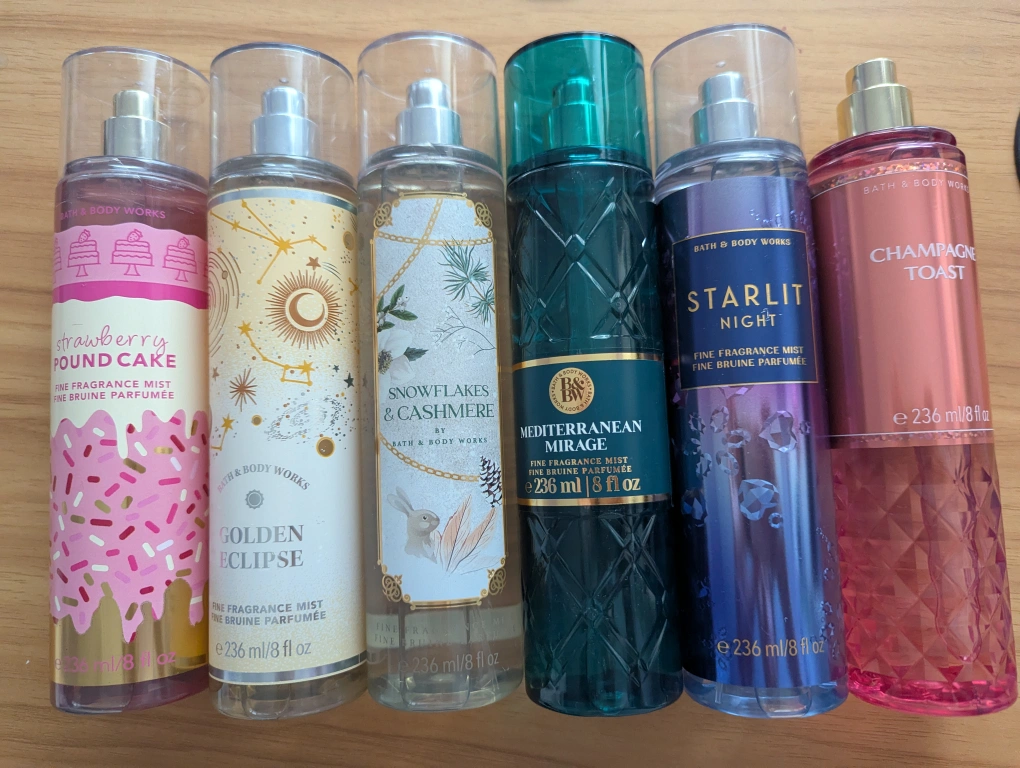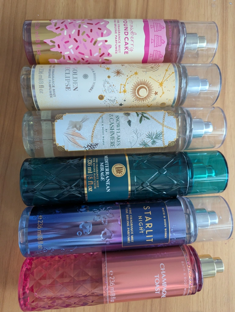 10Selling a set of Bath & Body Works Fine Fragrance Mists! Includes the following scents: - Strawberry Pound Cake - Golden Eclipse - Snowflakes & Cashmere - Mediterranean Mirage - Starlit Night - Champagne Toast Each bottle contains 236 ml / 8 fl oz Originally $18.95 each Now $5.00 Each
