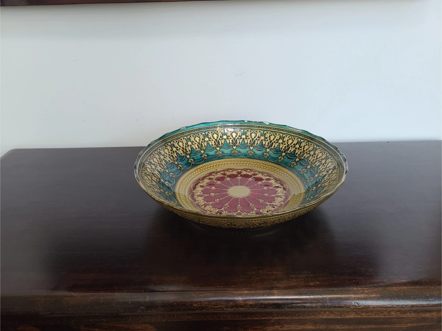 71Selling a beautiful decorative bowl. It has a lovely design with teal, gold, and red colours. It would look great as a centrepiece or accent piece in your home!