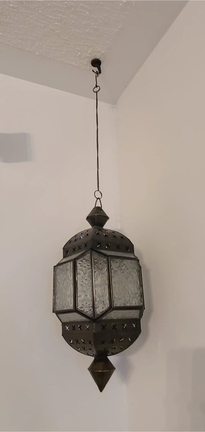 71This is a beautiful hanging lantern with a Moroccan-inspired design. It features decorative metalwork and textured glass panels. It would add a touch of elegance to any room!