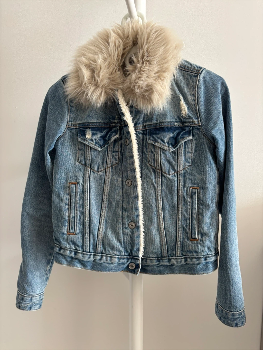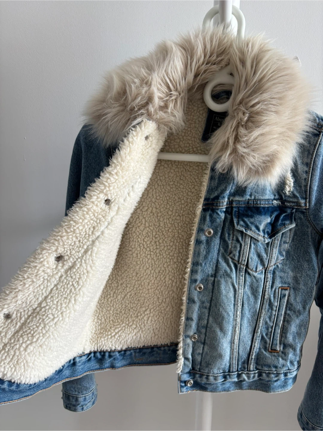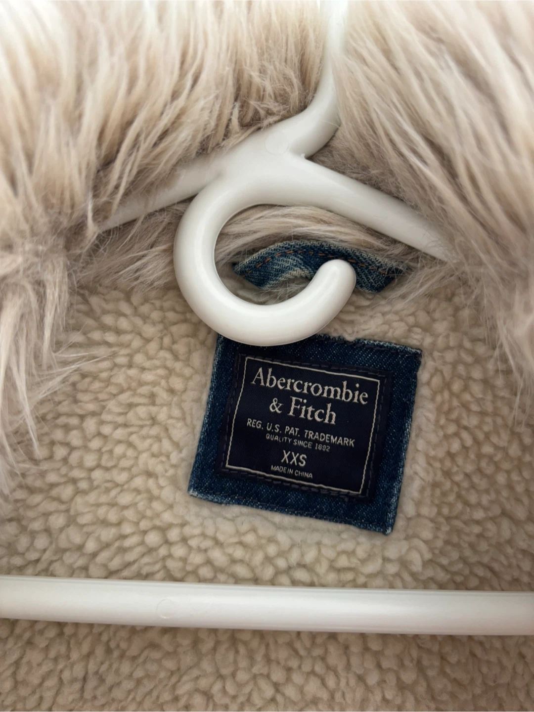 110I'm selling an Abercrombie & Fitch Sherpa denim jacket in size XXS. It has a faux fur collar and lining, perfect for adding a bit of warmth and style to your outfit! The material is a blend of cotton and polyester. Collar is removal. Sherpa lining is only around body and not arms area.