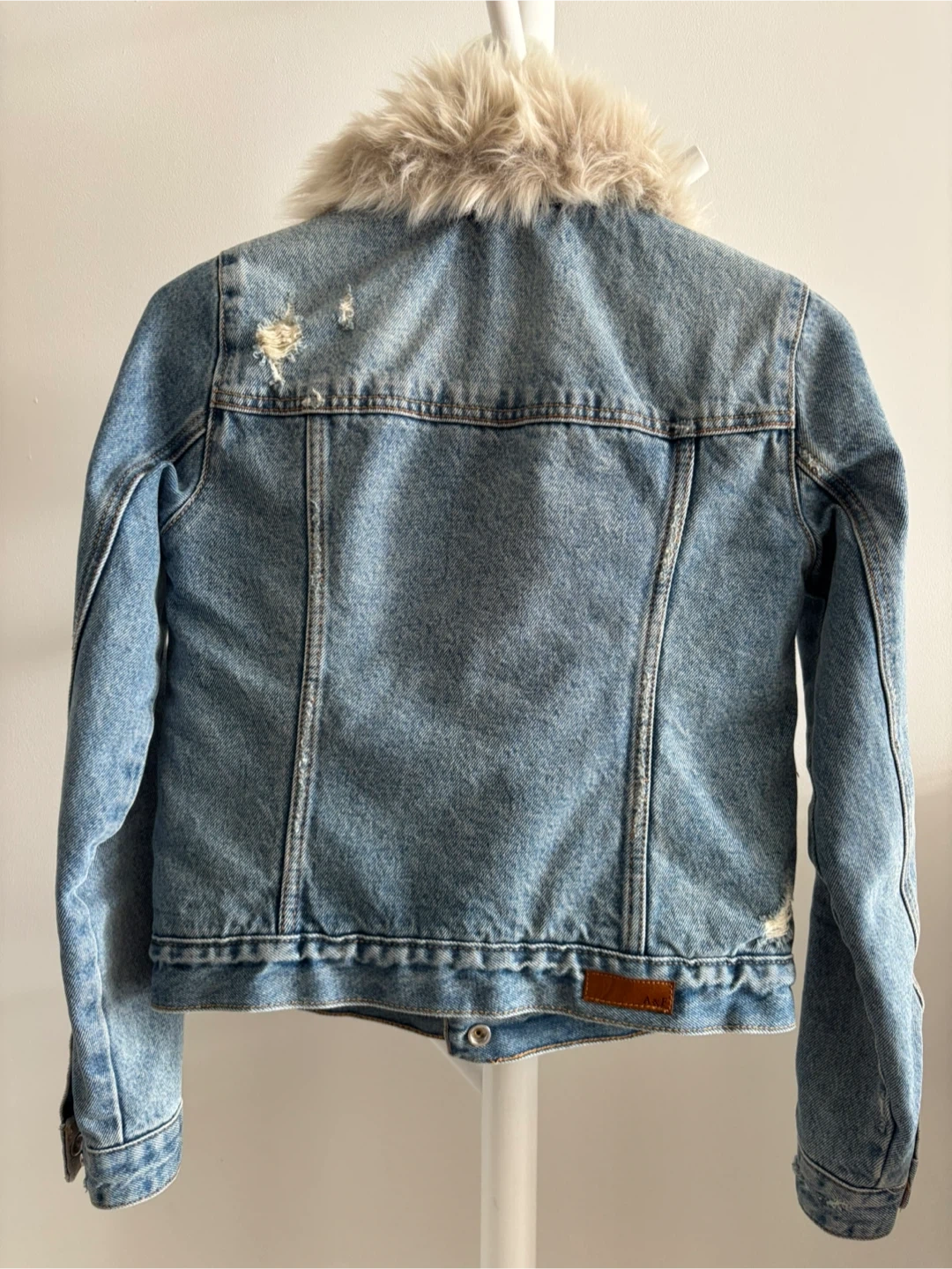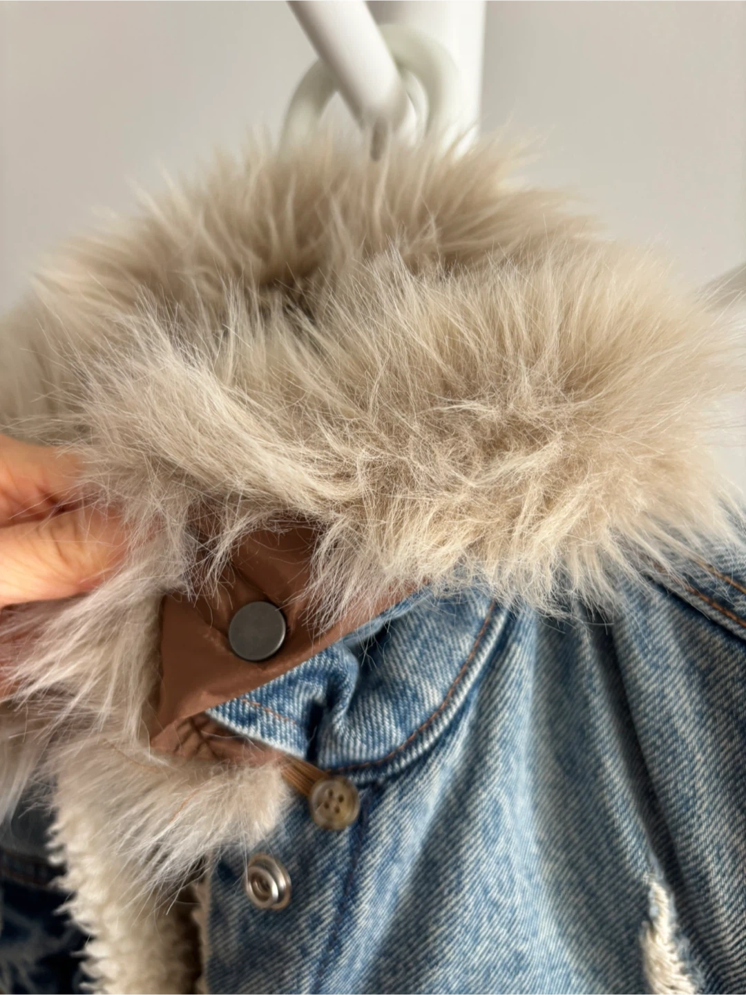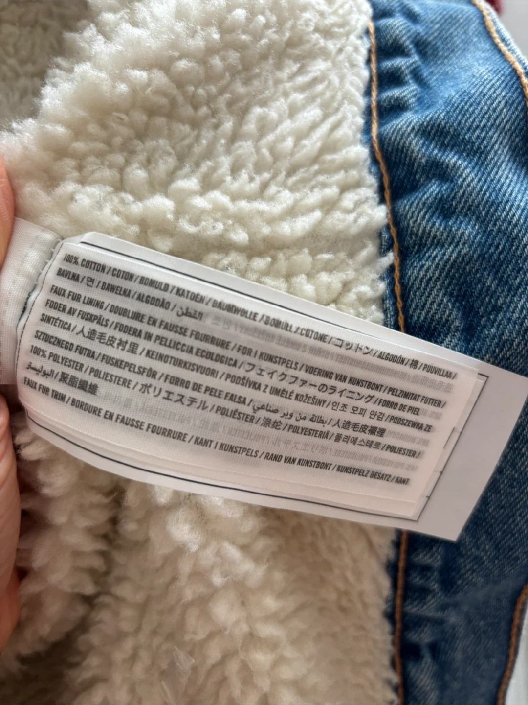 110I'm selling an Abercrombie & Fitch Sherpa denim jacket in size XXS. It has a faux fur collar and lining, perfect for adding a bit of warmth and style to your outfit! The material is a blend of cotton and polyester. Collar is removal. Sherpa lining is only around body and not arms area.