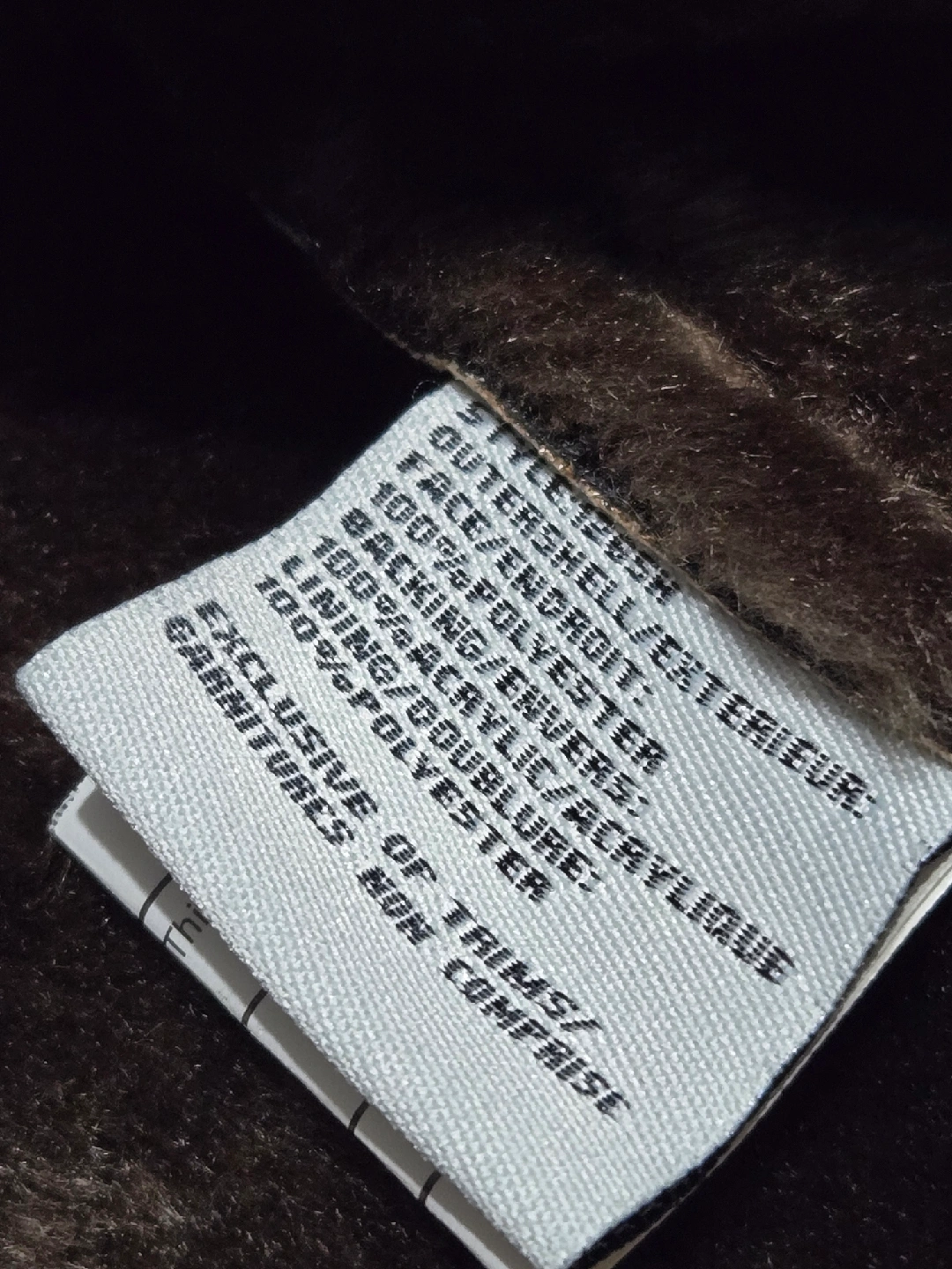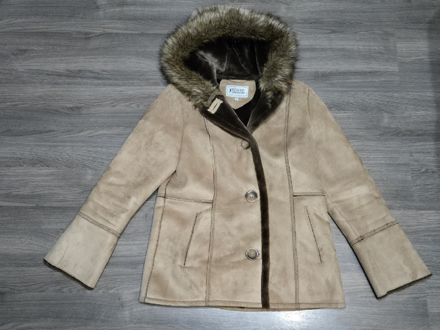Here's a Tower by London Fog jacket in a lovely beige colour! It's made of faux suede and features a faux fur trim. The size is M. The outer shell is 100% polyester, face/endroit: 100% polyester, backing/envers: 100% acrylic/acrylique, lining/doublure: 100% polyester, exclusive of trims/ garnitures non comprise