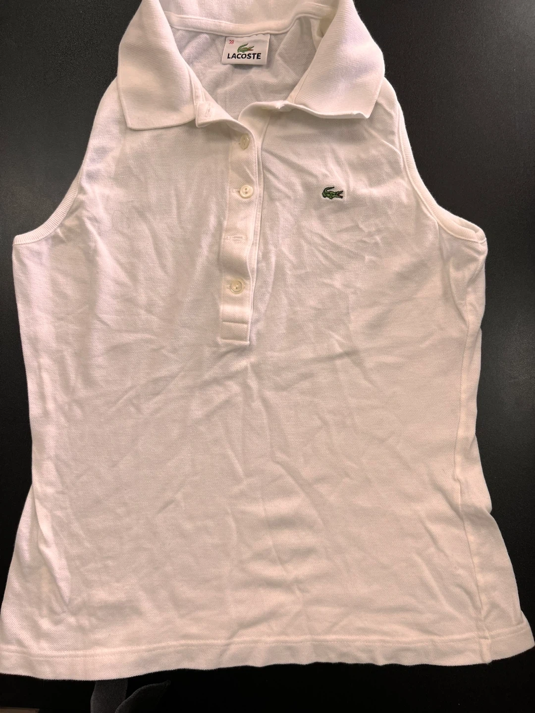 Selling a gently used Lacoste polo tank top in white. It's a size 38. The classic polo design with the iconic Lacoste logo makes it a stylish addition to any wardrobe!