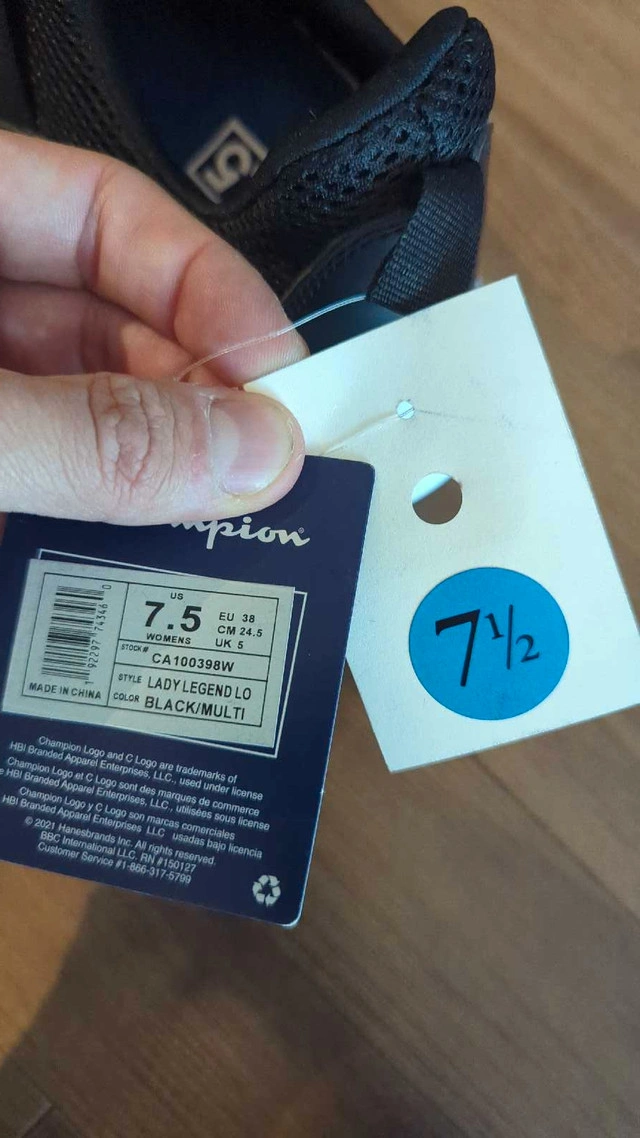 Comfort and sporty flair, perfect for workouts or casual outings. Never been worn, these are ready for their first adventure! Specifications: * Brand: Champion * Style: Lady Legend Lo * Colour: Black/Multi * Size: US 7.5