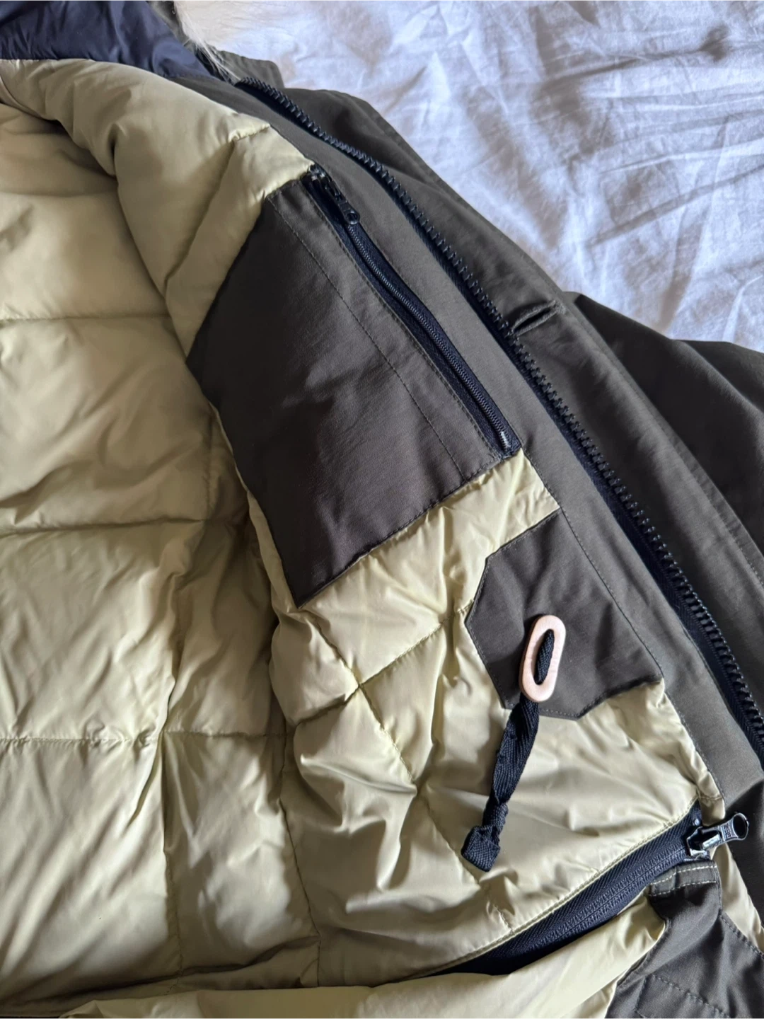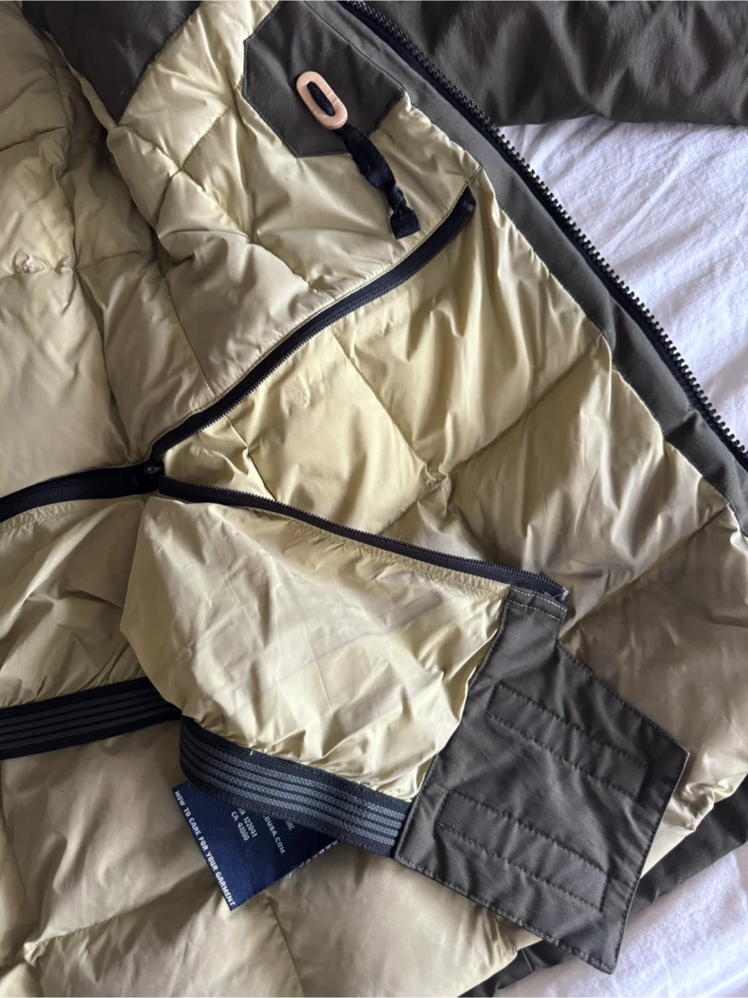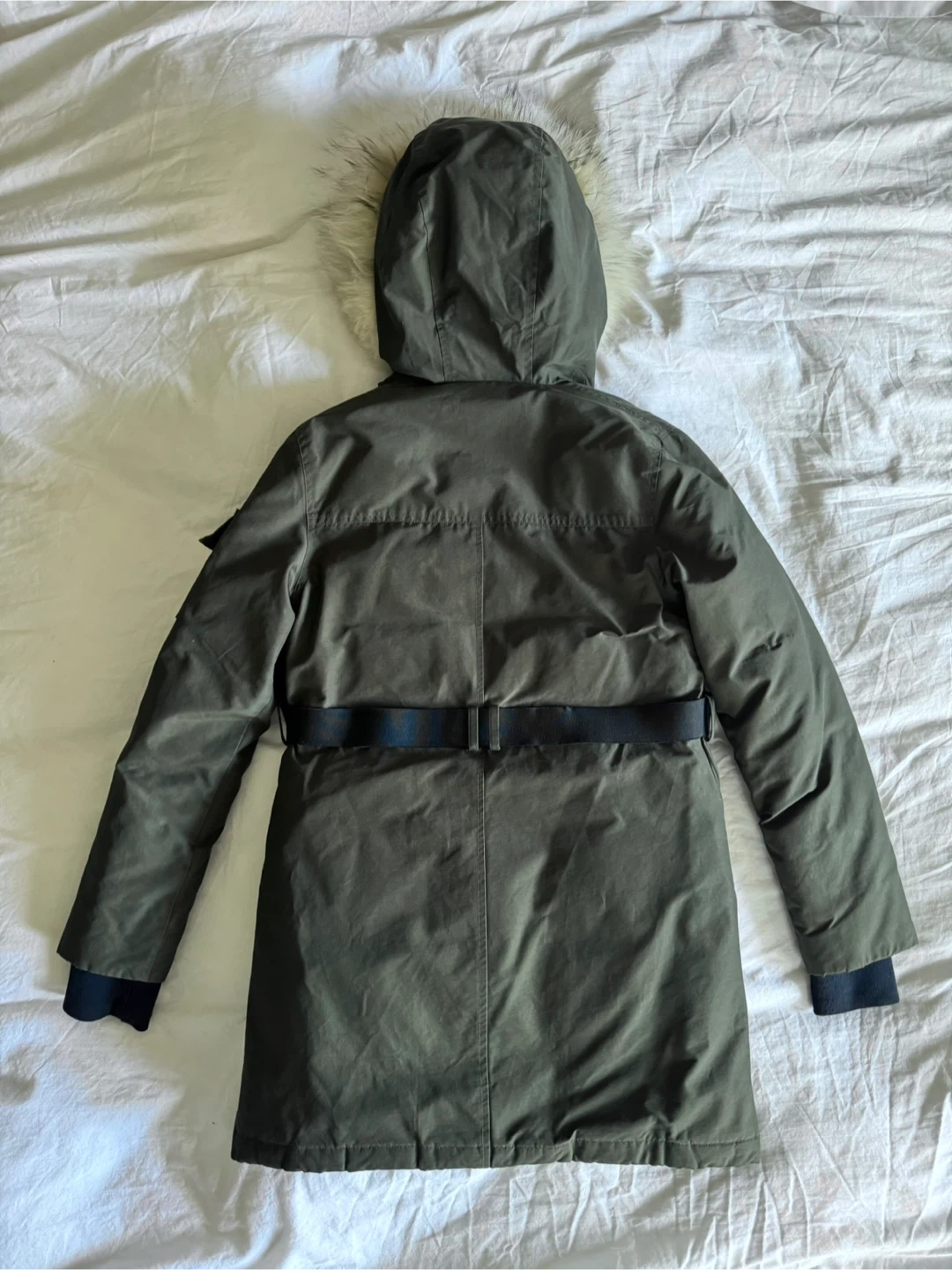 60% cotton & 40% nylon shell. 80% down and 20% duvet feathers — it’s very warm. Length hits mid-thigh. It’s in great condition with no rips or stains. Bought brand new for $650 CAD.